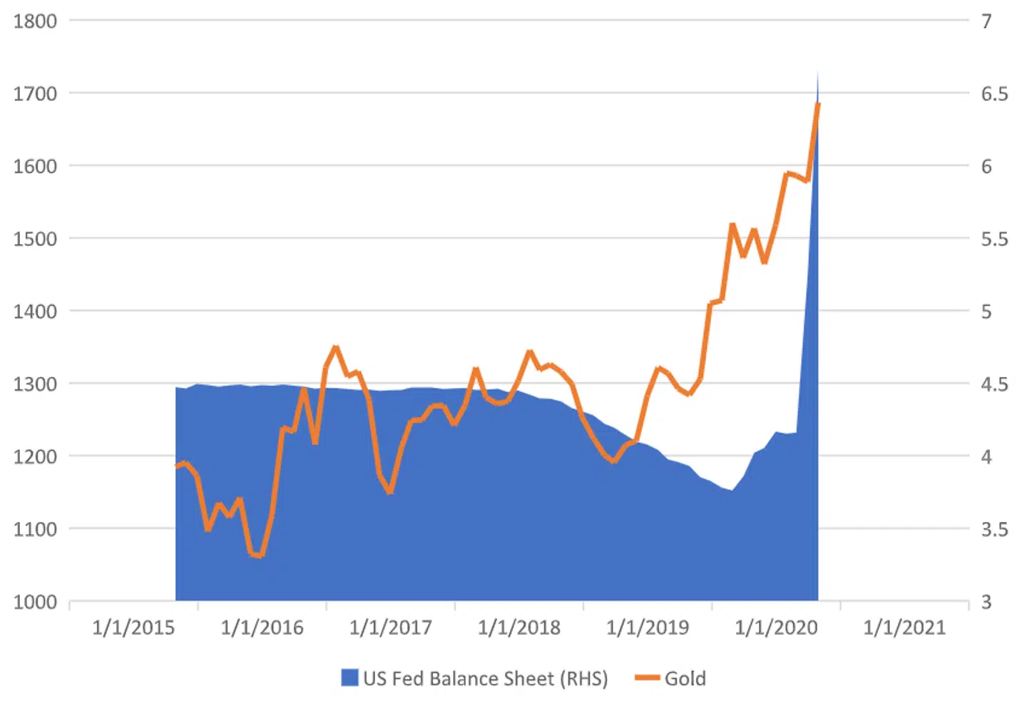 Der er stor sammenhæng mellem centralbankernes pengeskabelse (udvanding af værdien af penge) og prisen på guld målt i udvandede penge. Således er guldprisen steget 35 pct. det sidste år og over de sidste 20 år steget fra 300 dollar pr. oz. til 1700 dollar i dag, eller 9,5 pct. om året – i forhold til 5,5 pct. for det amerikanske aktiemarked over samme periode. Sjovt nok svarer stigningen i guld til stigningen i FED’s balance over samme periode.