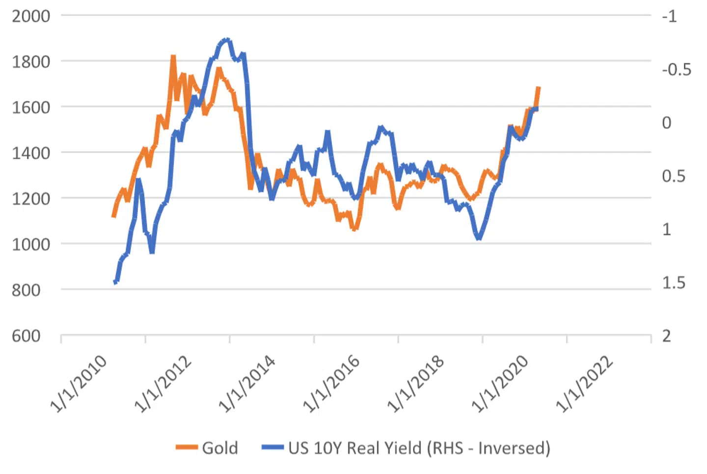 Den væsentligste faktor til forklaring af guldprisen er udviklingen i realrenten. Som grafen nedenfor viser, stiger guldprisen, når realrenten falder, og omvendt. Dette skyldes, at guld ikke giver et afkast, og hvis man kan få et positivt realafkast i obligationer, er alternativomkostningen ved at holde guld positiv. Realrenterne kommer til at være super lave i de kommende mange år, understøttende guldprisen, fordi staterne kontrollerer renterne og ikke kan betale højere renter på den enorme gæld, der er opbygget.