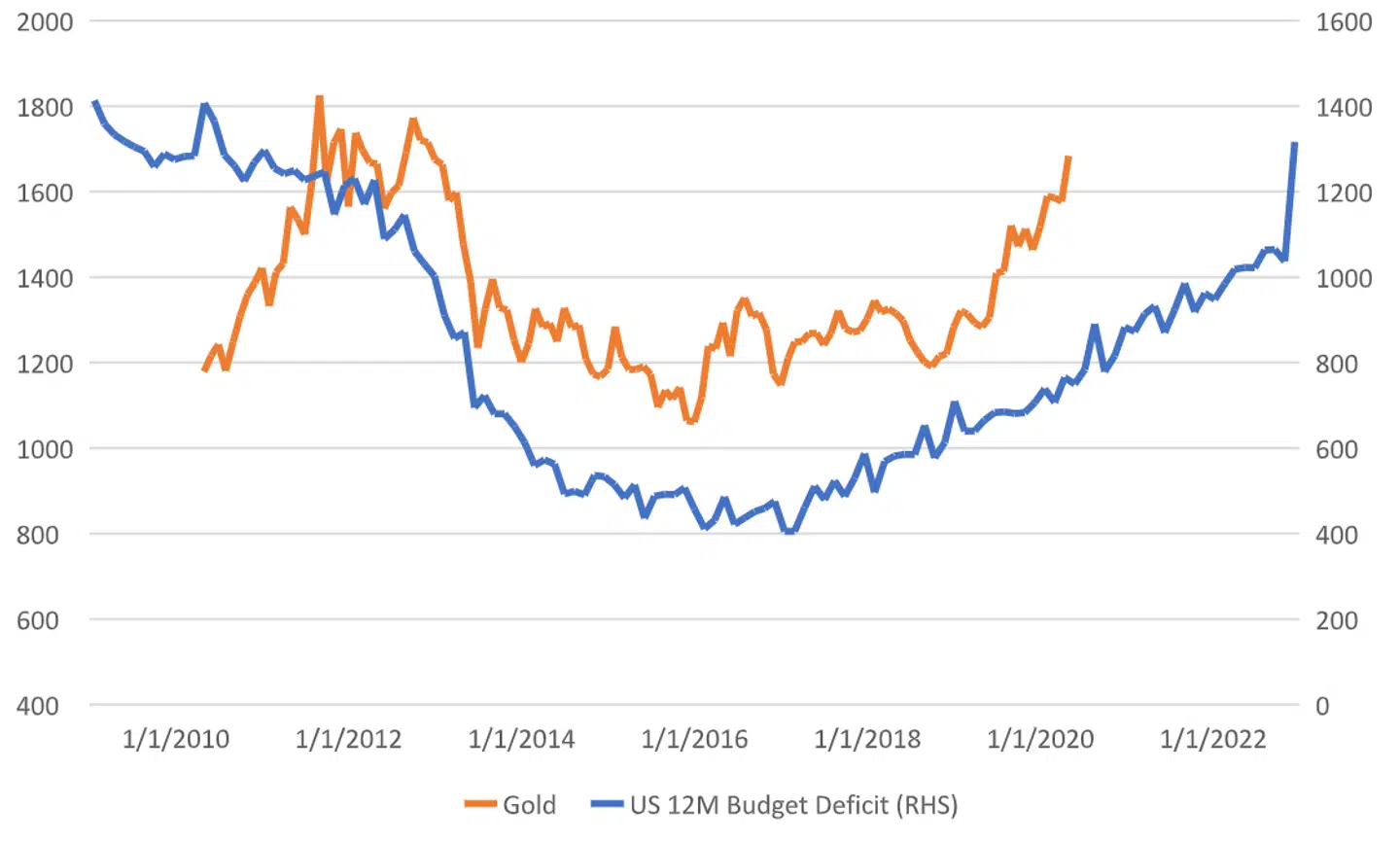 Velfærdsløfter bliver svære at honorere grundet aldringen af vores befolkninger. Høje budgetunderskud understøtter således guldprisen, som grafen nedenfor viser.