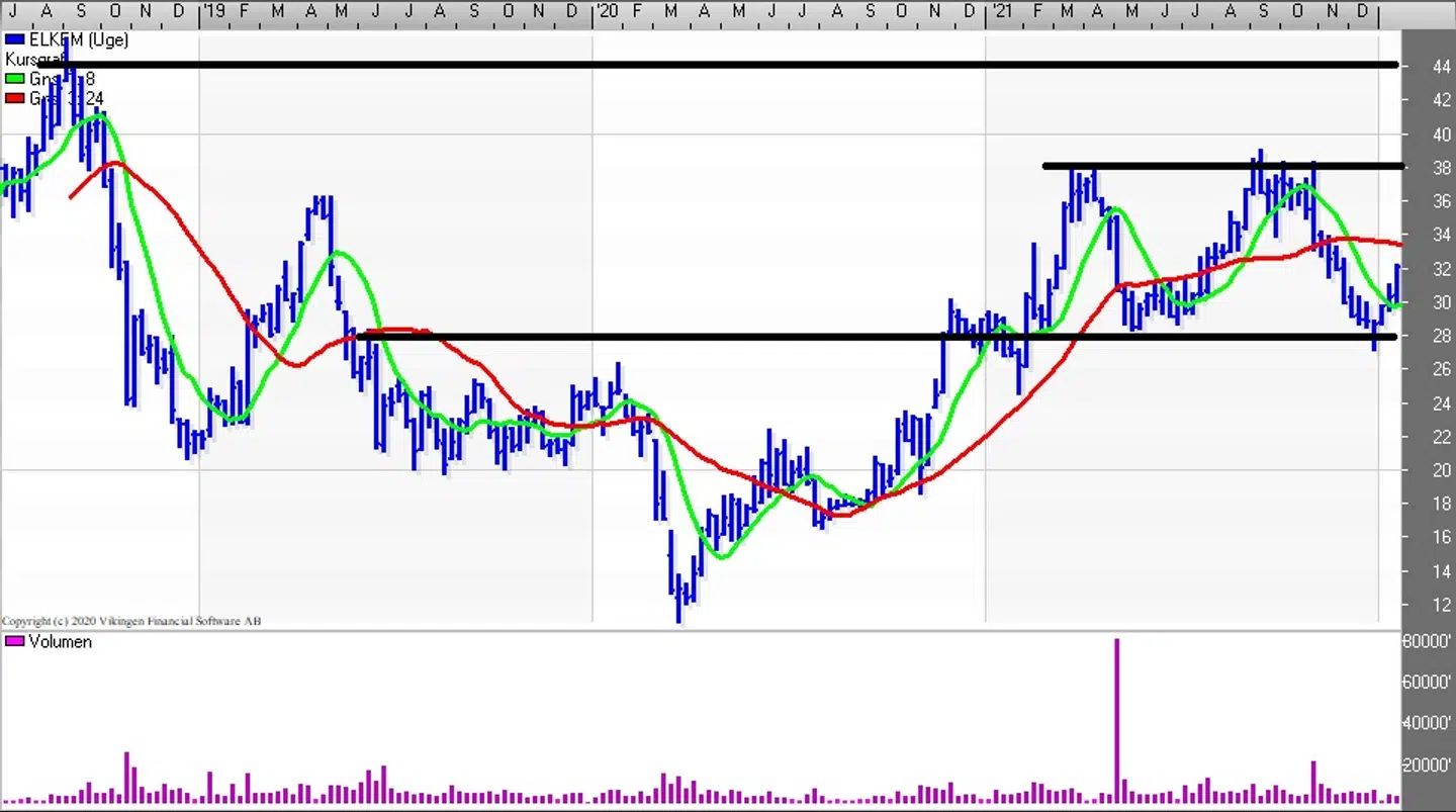 Elkem testede støtteniveauet 28 for 4 uger siden og siden har aktien været i en stigende tendens og fredag lukkede aktien i 32,16.