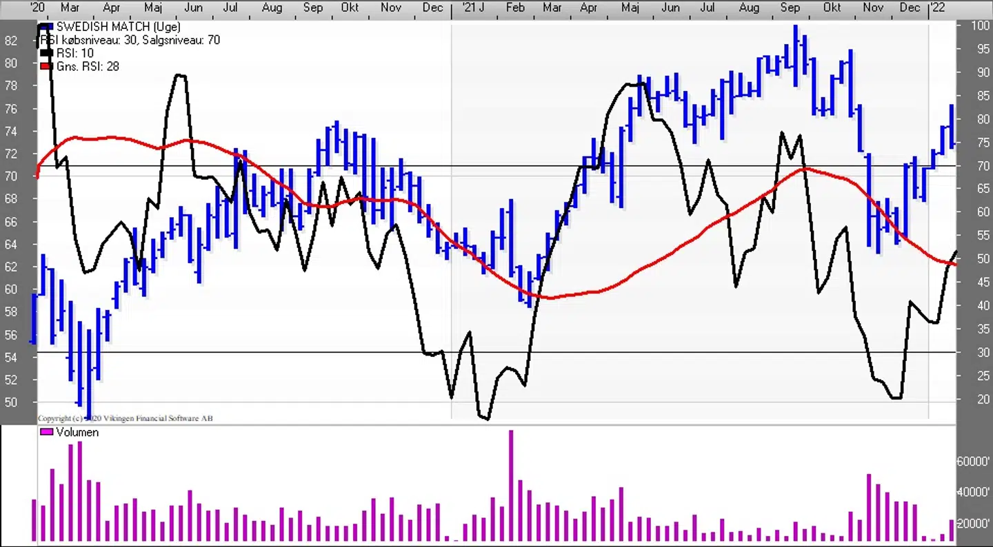 Swedish Match har været i en stigende tendens siden begyndelsen af december efter 3 ugers konsolidering i niveauet 64-66. På dagsniveauet etablerede Bollingerkanalen et købsignal i midten af december og samtidig blev der etableret et mindre ”break away gap” 66,76-68.84.