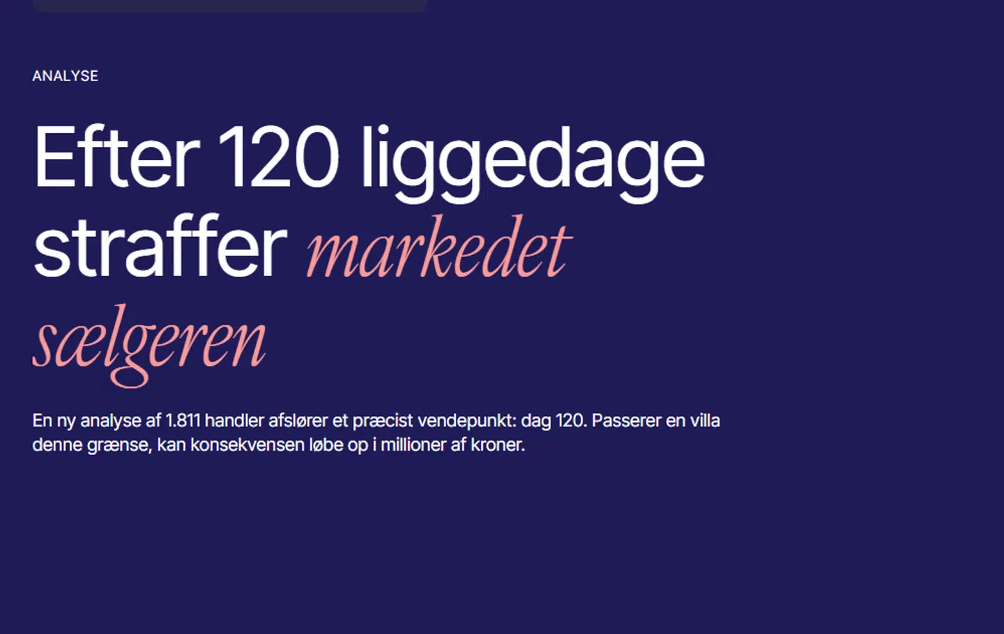 Liebhavermægleren Liebe har analyseret 1.811 villahandler og identificeret et præcist vendepunkt i salgsprocessen. Konklusionen er entydig: Sælgere, der passerer 120 liggedage, betaler en høj pris for ventetiden.