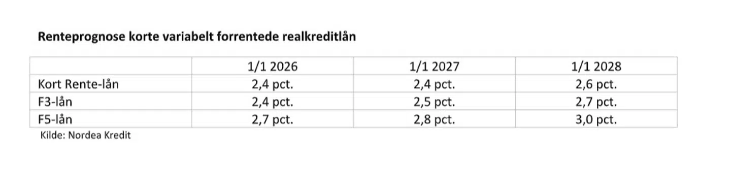 Investorerne søger den højst mulige risikojusterede rente, så når de korte europæiske renter stiger, følger de danske efter. Derfor forventer vi stort set uændrede korte realkreditrenter i 2026 og en moderat stigning i 2027.