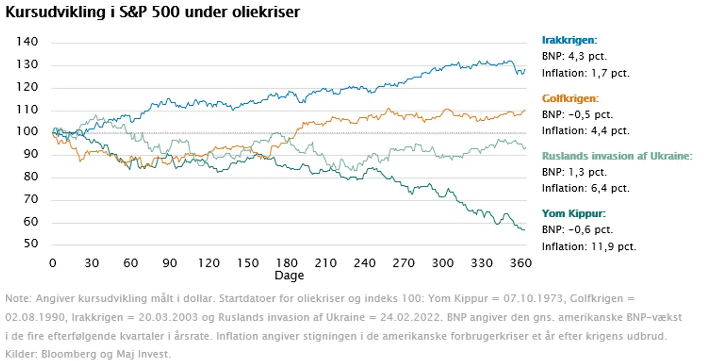 Historisk har oliekriser påvirket aktiemarkedet forskelligt. I gennemsnit er aktiemarkedet dog tæt på uændret 12 måneder efter en oliekrise.