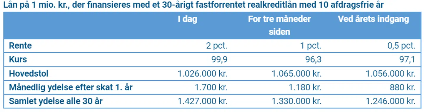 Over hele lånets løbetid vil boligejeren komme til at betale 1.427.000 kr. tilbage. Var lånet blevet optaget for tre måneder siden, ville boligejeren slippe med at skulle betale 1.330.000 kr. tilbage, mens det samme lån kun kostede 1.246.000 kr. i samlede ydelser, hvis det blev optaget ved årets indgang.