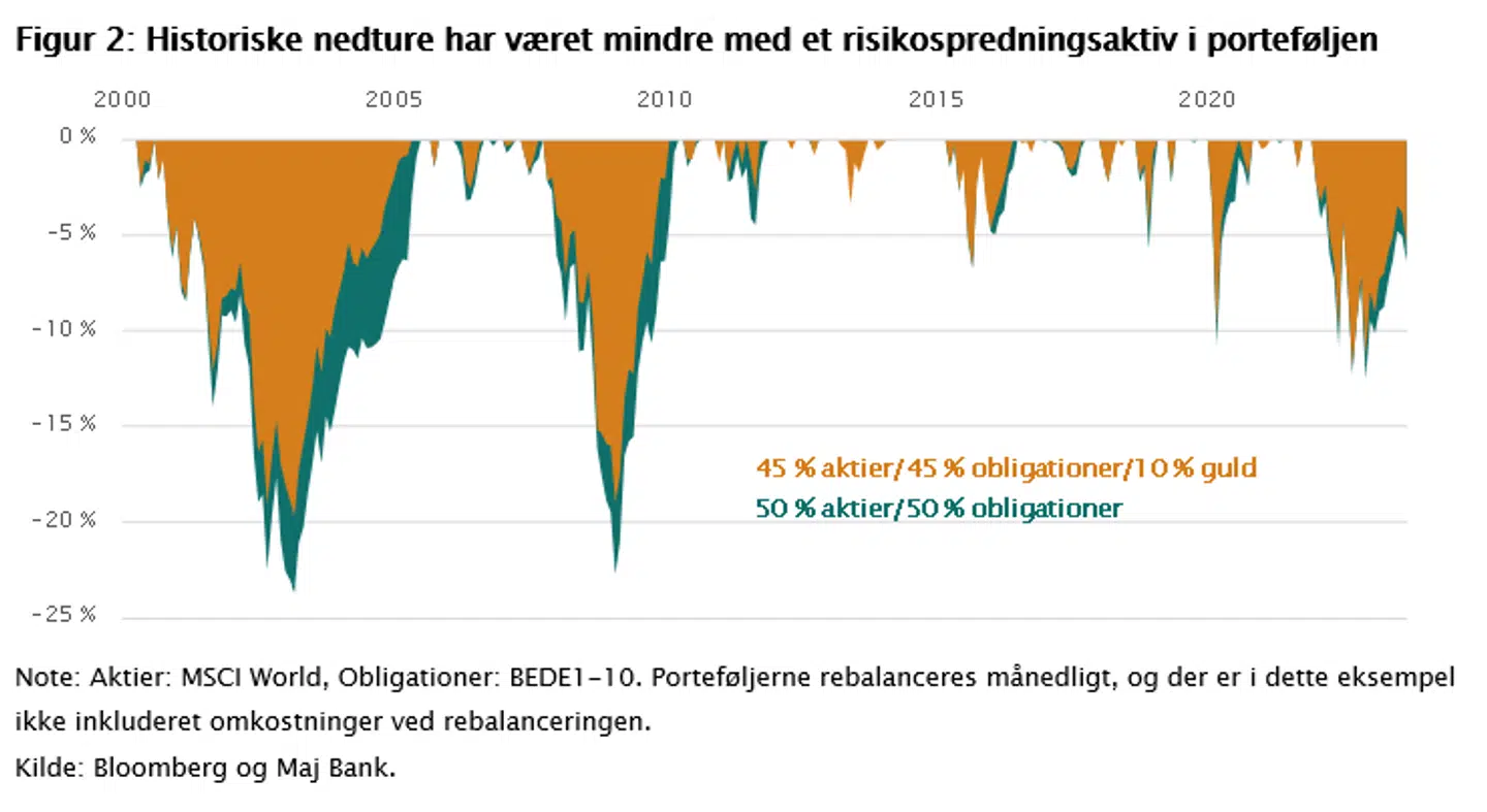 Afkastet kan blive positivt påvirket af at inkludere et risikospredningsaktiv, men den primære fordel er, at det reducerer porteføljens risiko. Det bliver tydeligt i figur 2, hvor risikoen målt ved porteføljens historiske nedture er vist. Her fremgår det, at porteføljen, hvor guld er inkluderet, faldt mindre og genvandt tabene hurtigere under de store kriser.