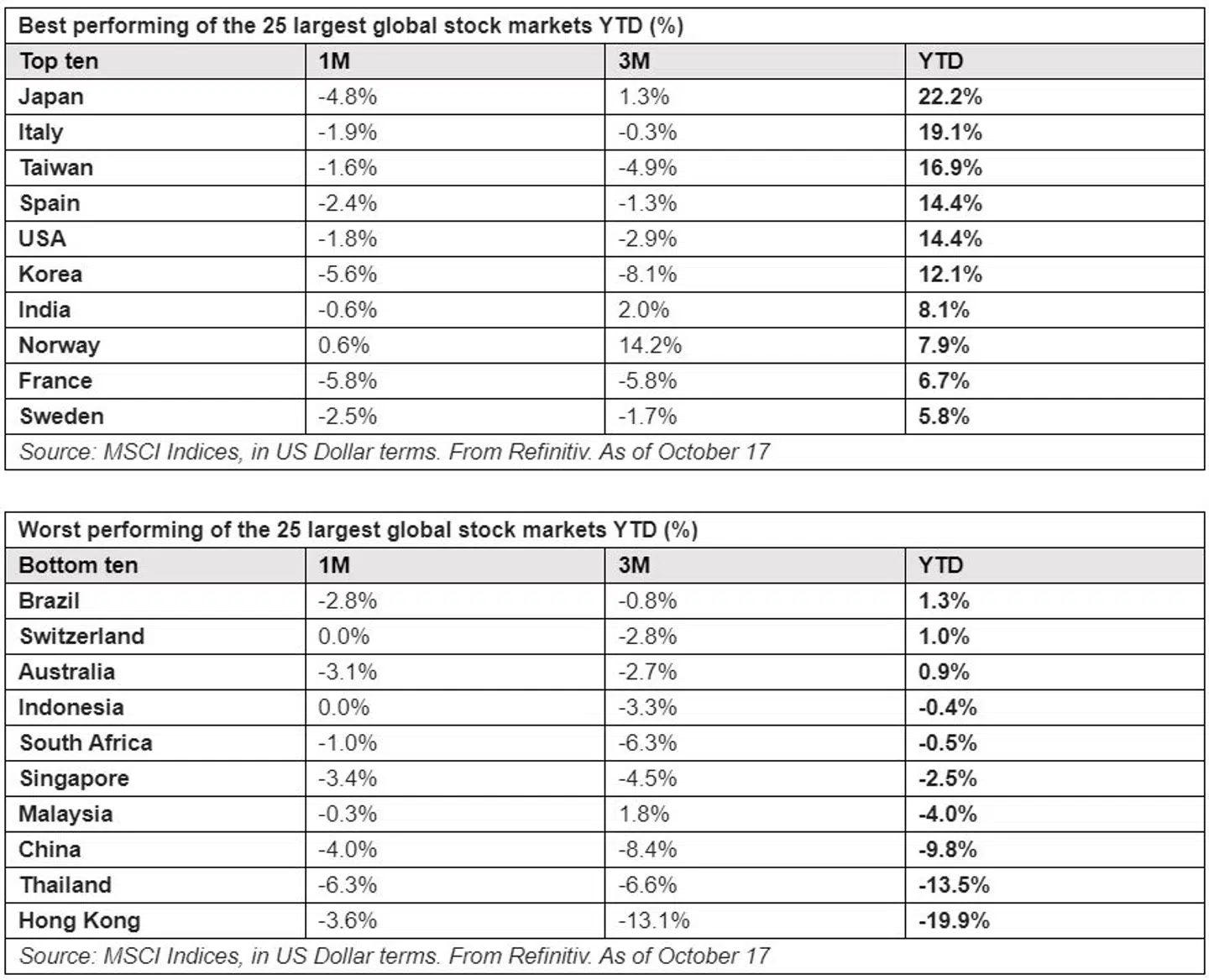 Det toneangivende japanske indeks er steget over 20 pct. siden årsskiftet.  Det er skarpt forfulgt af det italienske, der er steget 19,1 pct. mens det taiwanesiske aktiemarked har givet et solidt afkast på 16,9 pct.