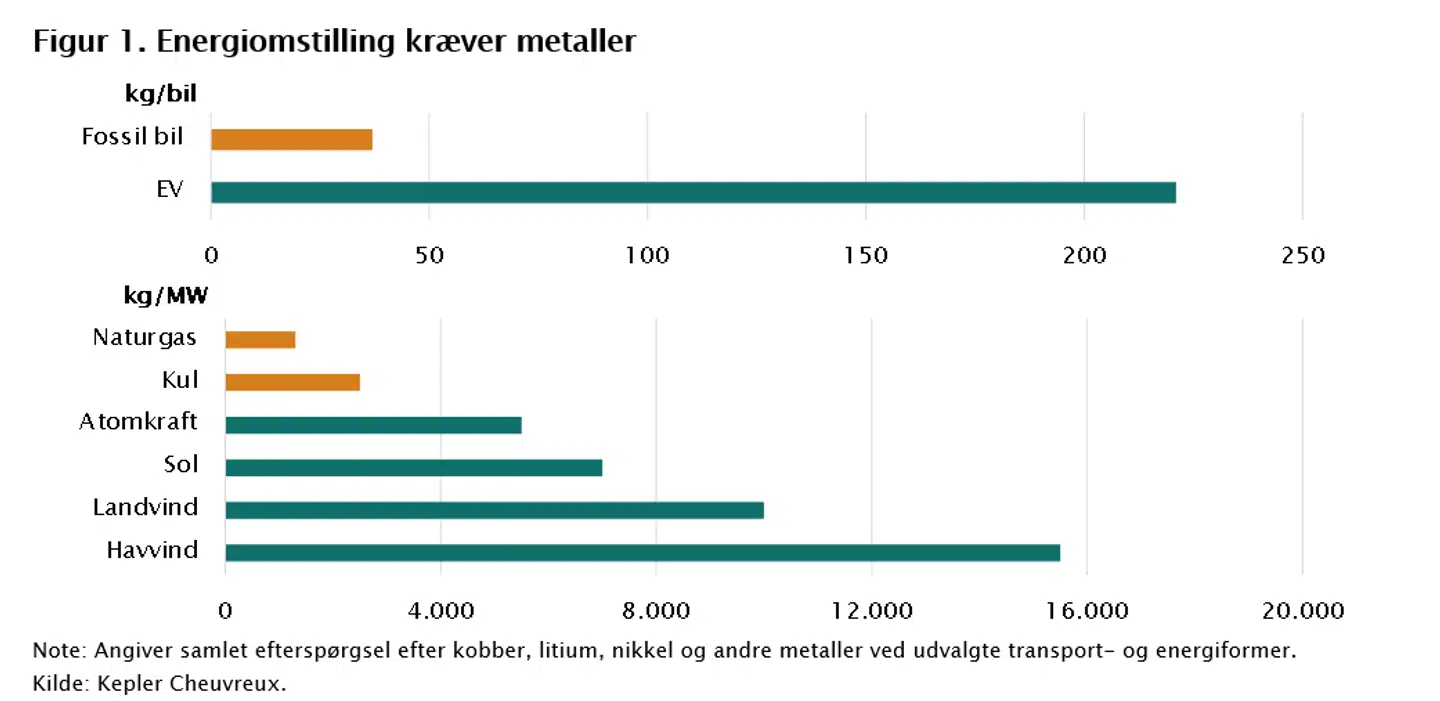 Elektrificeringen af det globale samfund kræver markant flere metaller end det fossile energisystem. Særligt kobber, nikkel og litium kan opleve større efterspørgsel via deres rolle i batterier og energiinfrastruktur.