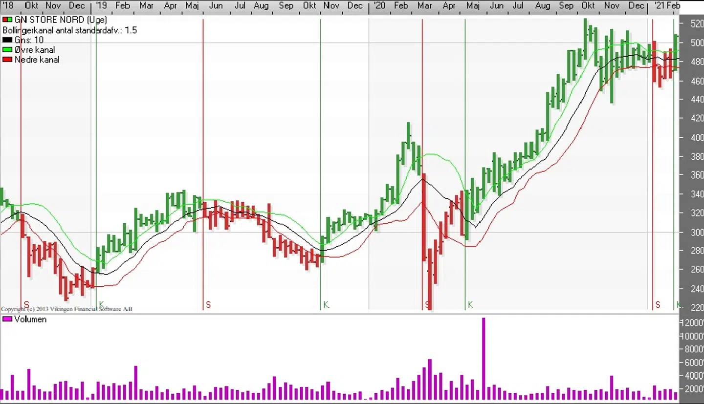 GN Store Nord toppede i 520 tilbage i oktober, og siden har aktien været i en faldende tendens frem til midten af januar, hvor aktien ramte niveauet 460. Siden har aktien været i en stigende tendens og handles nu i 510.
