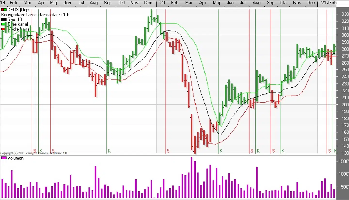 DFDS har været i køb på dagsniveauet siden begyndelsen af februar, hvor Bollingerkanalen etablerede et købssignal. De glidende gennemsnit har ligeledes etableret et »Golden Cross«efter 2½ måned med en sidelæns bevægelse i niveauet 260-280.