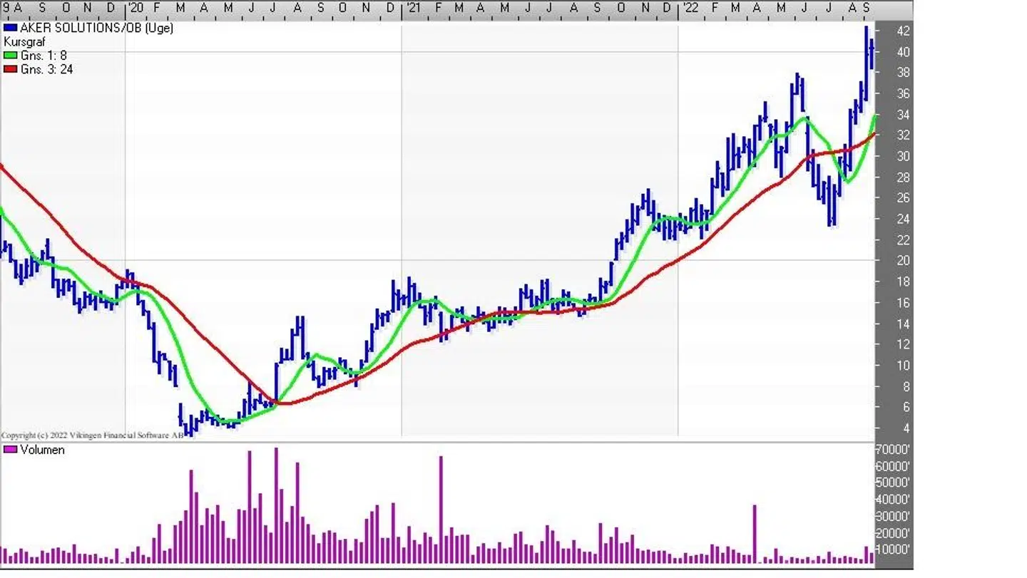 Aker Solution aktien etablerede en bundformation i juli i niveauet 23 og nu handles aktien i niveauet 40 – 41.