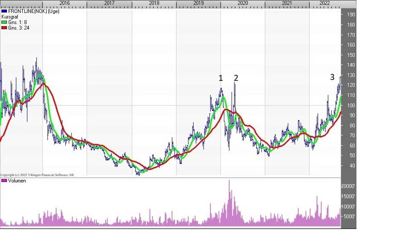 Købte man Frontline-aktier i 2018, kan man have betalt 1800 kr. for aktiens bund blev ramt i 2018, hvor kursen var i 31, hvilket er et tab på mere end 98 pct. I fredags lukkede aktien i 127,7 og kursen er steget med 103 pct.