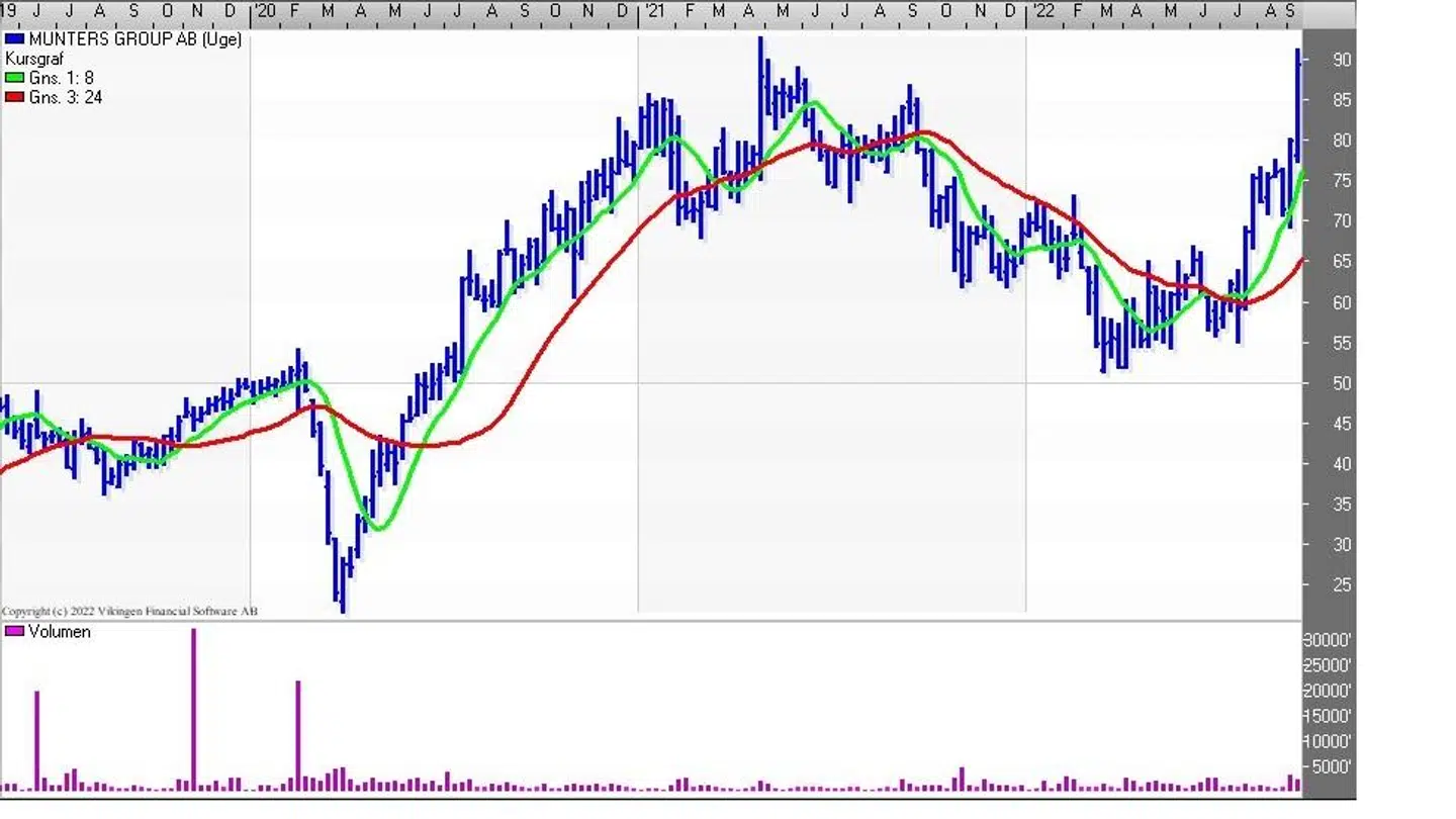 Aktien blev i maj-juni handlet i niveauet omkring de 60 og fredag lukkede aktien i 89.45.