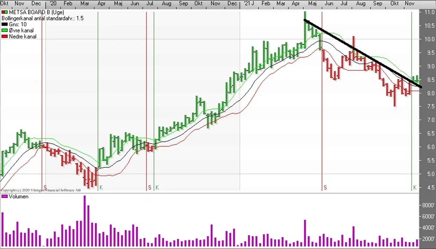 På dagsniveauet er der Metsä Board-aktien igen etablerede købssignal. Bollingerkanalen har været i køb siden midten af november. De glidende gennemsnit har etablerede et ”Golden Cross” for 8 dage siden. Det lange glidende gennemsnit lige i niveauet 8,3 som en støttelinie.