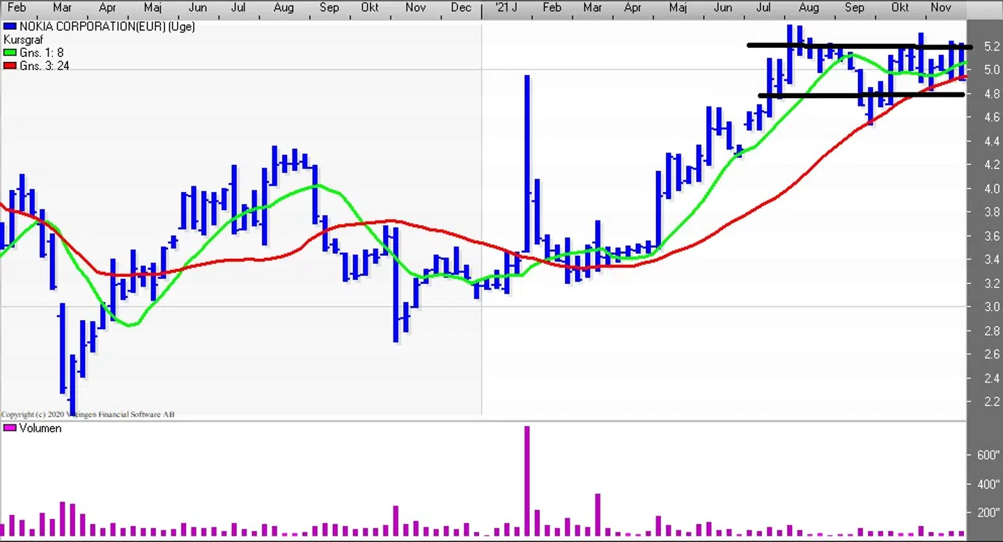 Nokia aktien har bevæget sig vandret i niveauet 5,0 – 5,2 og det har stået på siden midten af juli. Den vandret formation i aktiekursen betyder at det har været svært og finde et signal i aktien de seneste måneder. Både Bollingerkanalen og de glidende gennemsnit på 8 og 24 dage har haft svært ved at finde et brugbart signal.