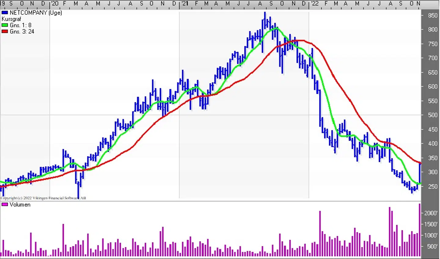 Netcompany-aktien har været i en faldende tendens fra september/oktober og frem til den uge, hvor aktien tog et stort spring op fra kurs 272,8 til kurs 328,20 fredag. På dagsniveauet etablerede Bollingerkanalen et købssignal for 9 dage siden.