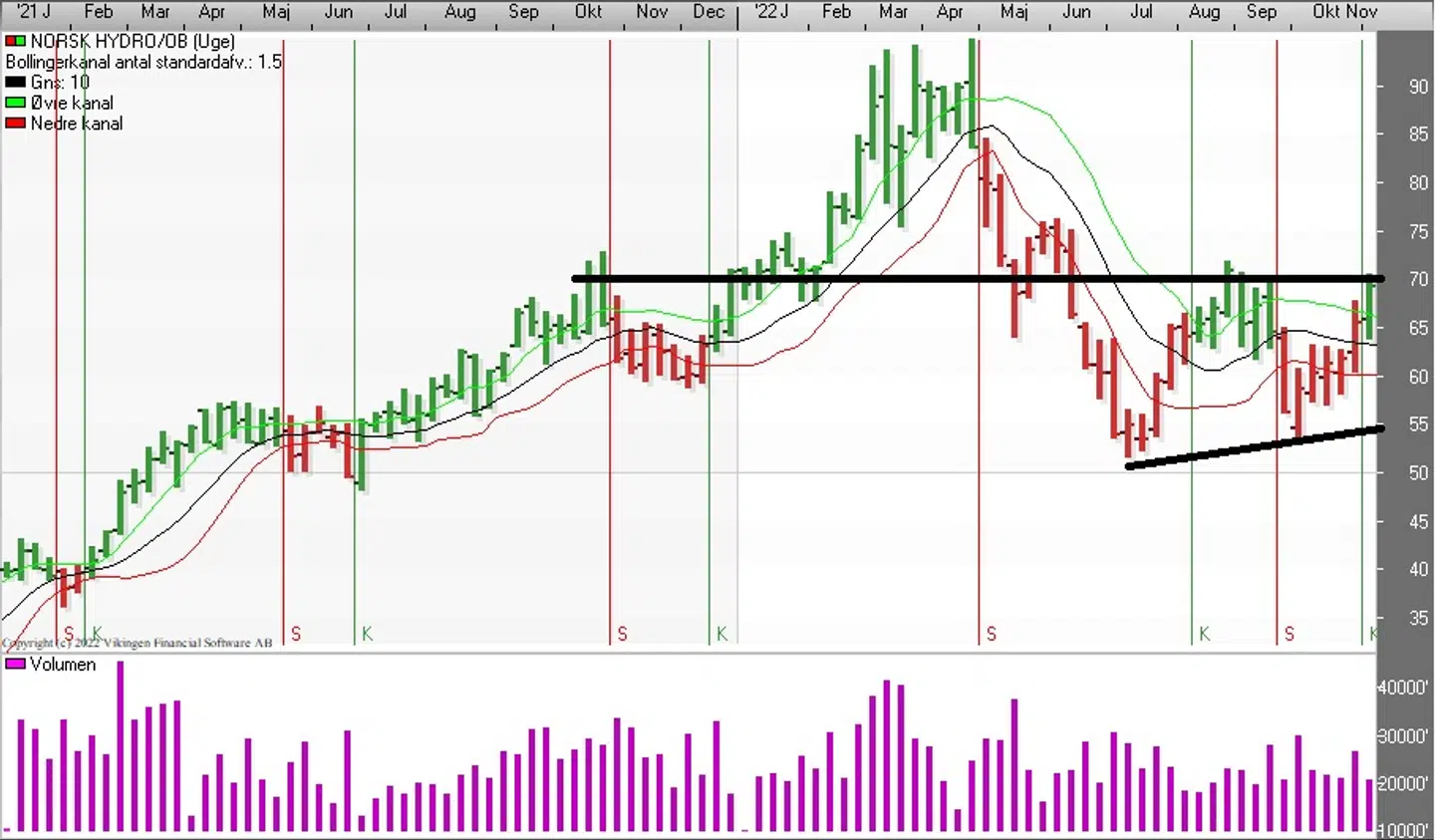 Norsk Hydro-aktien har været i en stigende tendens siden bunden i slutningen af september, hvor aktien blev handlet i niveauet 55 og fredag lukkede Norsk Hydro i 69,38.