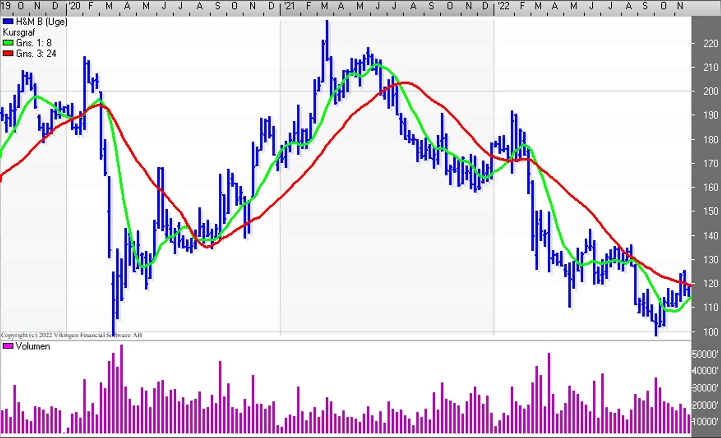 H&M-aktien har været i en faldende tendens fra marts 2021 og aktien fandt en bund i niveauet 100 i begyndelsen af oktober. På dagsniveauet er der etableret et salgssignal i Bollingerkanalen for 6 dage siden. Kursen er faldet tilbage de sidste par dage og holder tendensen, bliver der etableret et Death Cross.