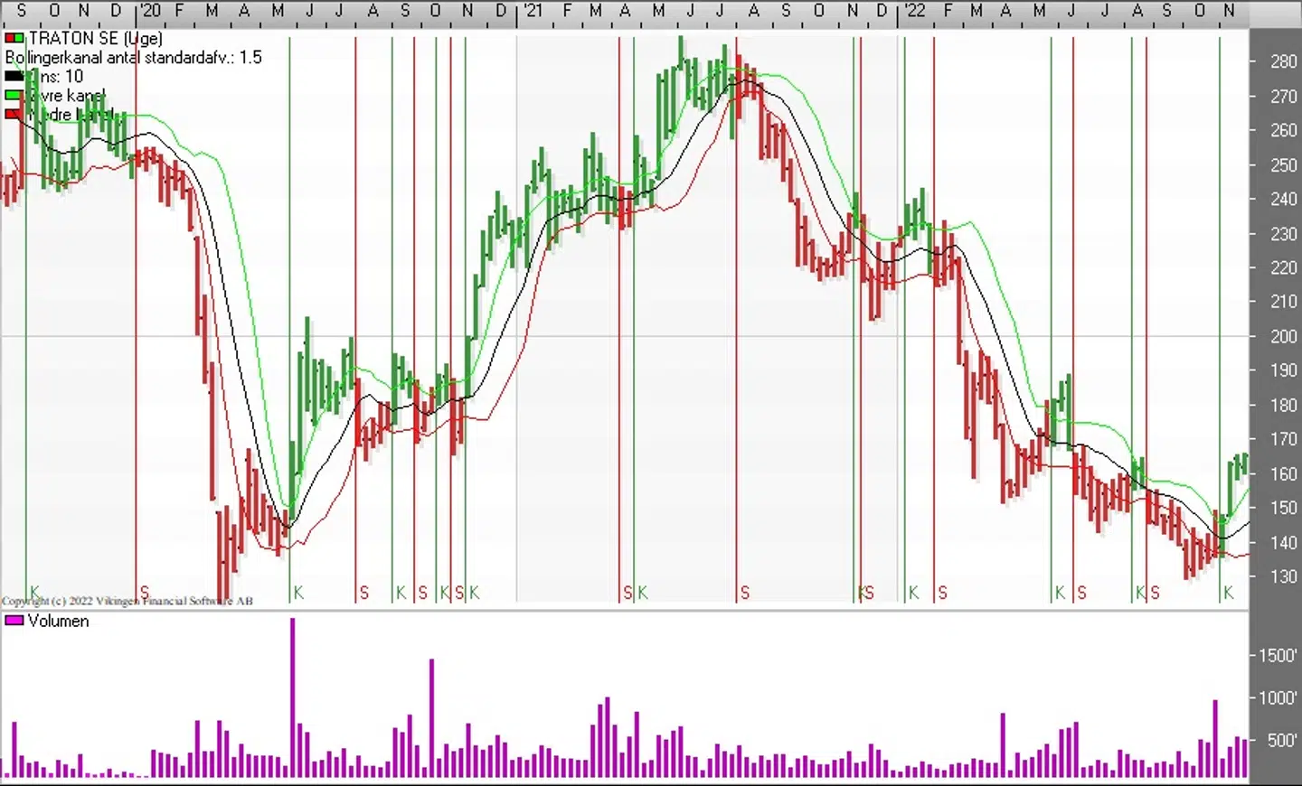 På ugebasis er der købssignal i Bollingerkanalen som blev etableret for 2 uger siden. De glidende gennemsnit er blevet brudt nedefra. Holder den stigende tendens, så bliver der etableret et Golden Cross i løbet af 2-4 uger.