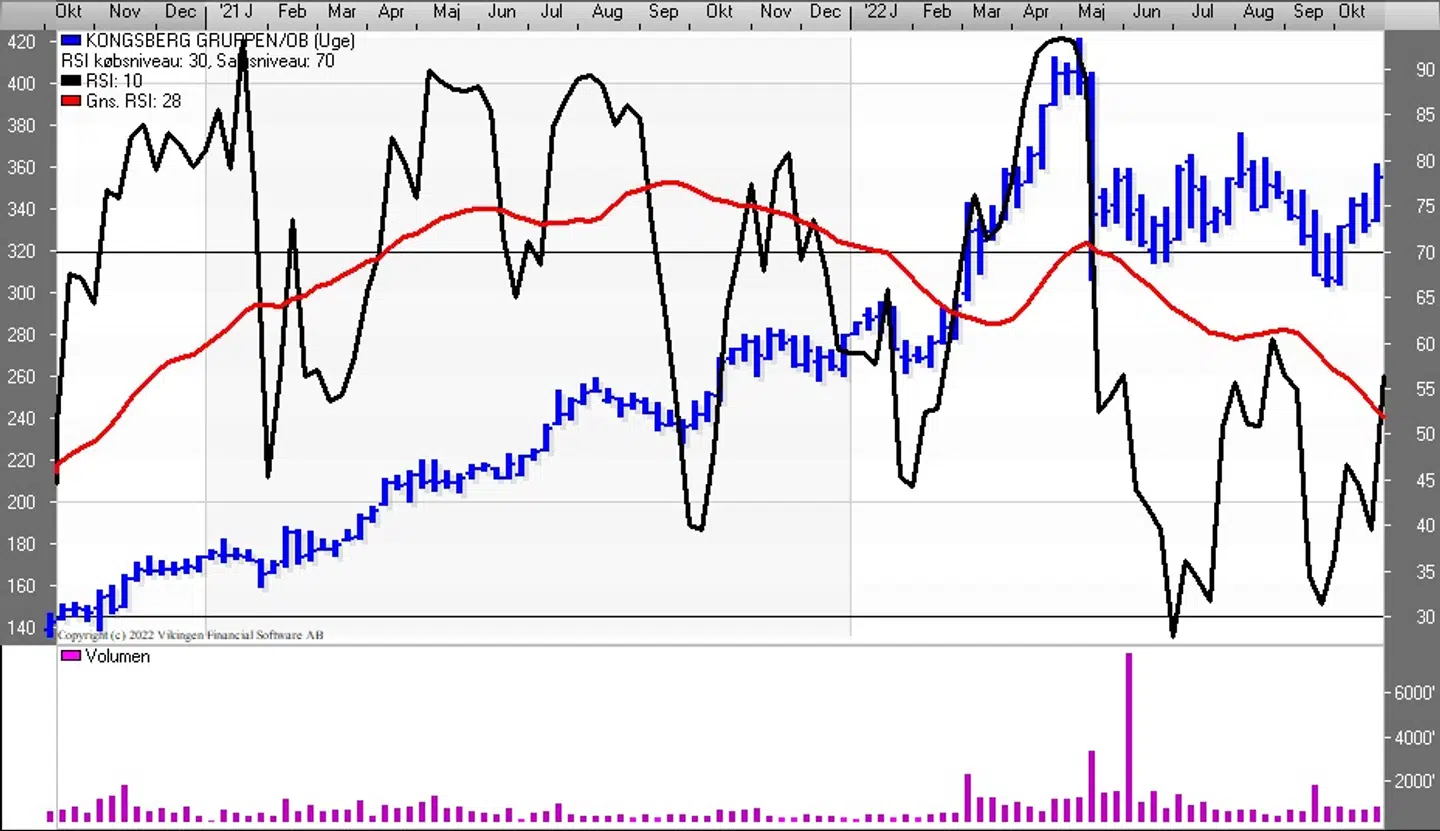 Kongsberg Gruppen toppede i april/maj i niveauet 420 og lukkede i fredags i niveauet 360. På dagsniveauet er der købssignal i Bollingerkanalen og de glidende gennemsnit har etableret et Golden Cross i begyndelsen af oktober.