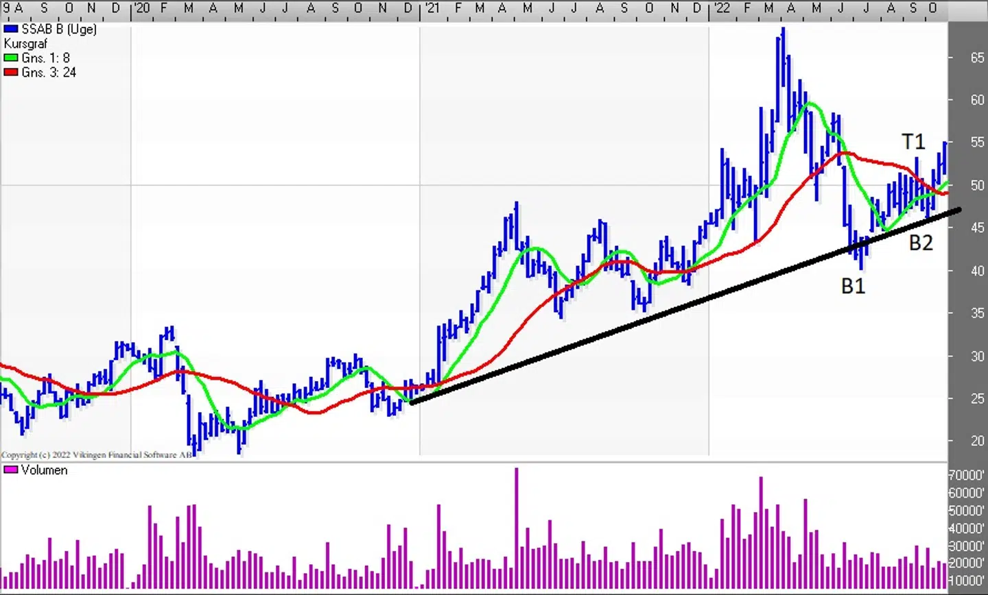 SSAB Holder fast i den svagt stigende tendens efter der blev etableret en bundformation i juli i niveauet 40-41 og anden bund var i begyndelsen af oktober i niveauet 46. Fredag lukkede aktien i 55.