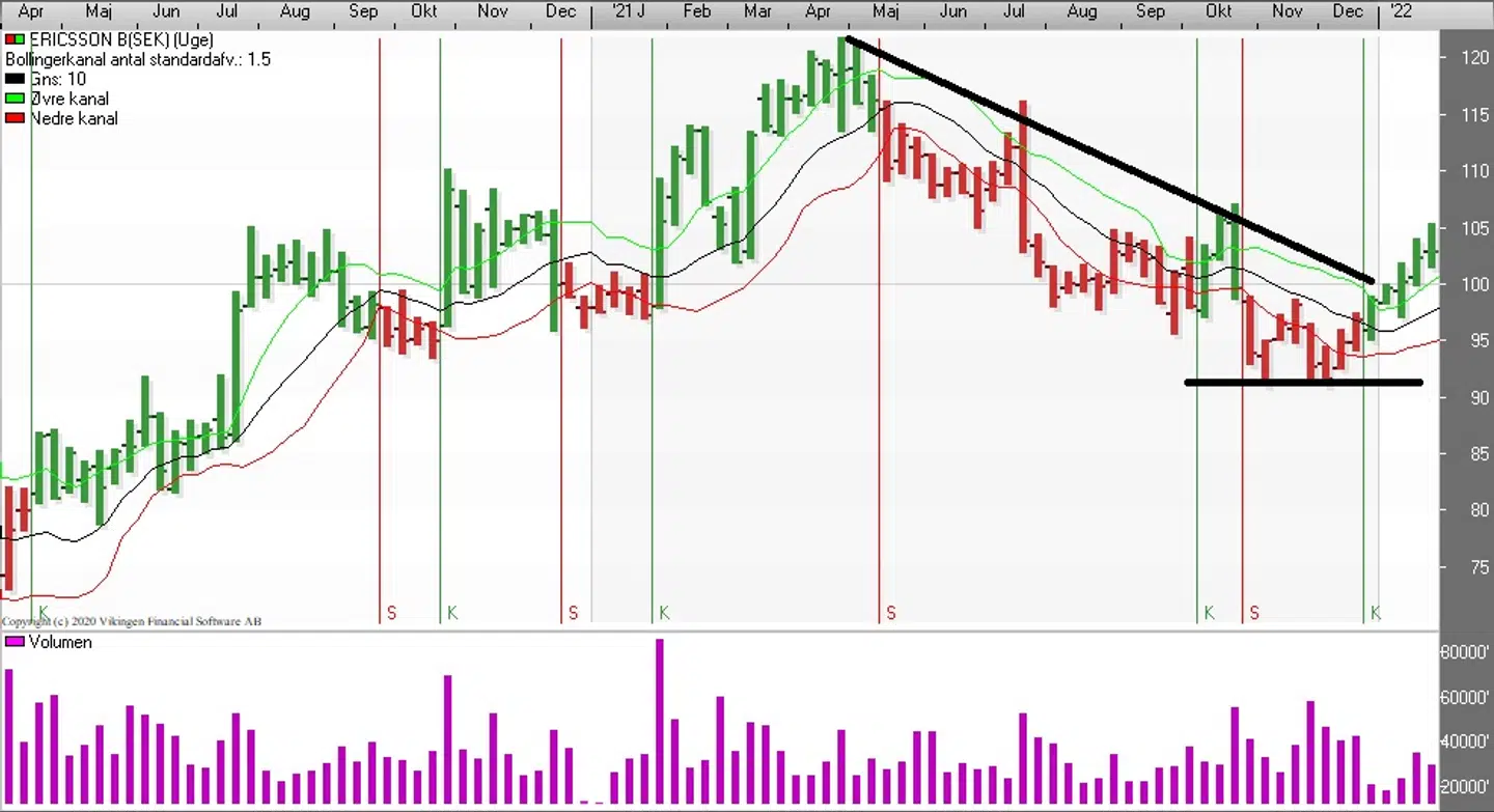 I den kommende uge er der årsregnskab fra Ericsson. Aktien lå i en faldende tendens efter toppen i februar og frem til november/december, hvor aktiekursen fandt en bund i niveauet 92-94 og siden har aktien været i en stigende tendens og fredag lukkede aktien i kurs 103,60.