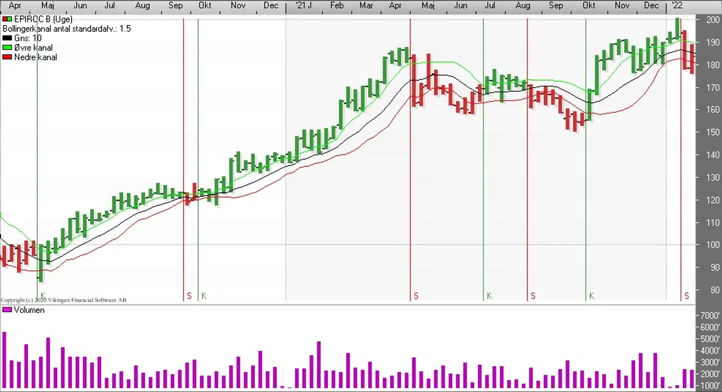 Bollingerkanalen er gået i salg på dagsniveauet grundet den faldende tendens i kursen. På ugebasis er der ligeledes købssignal i Bollingerkanalen, men det lange glidende gennemsnit ligger som en støttelinie i niveau 176 som en støttelinie.