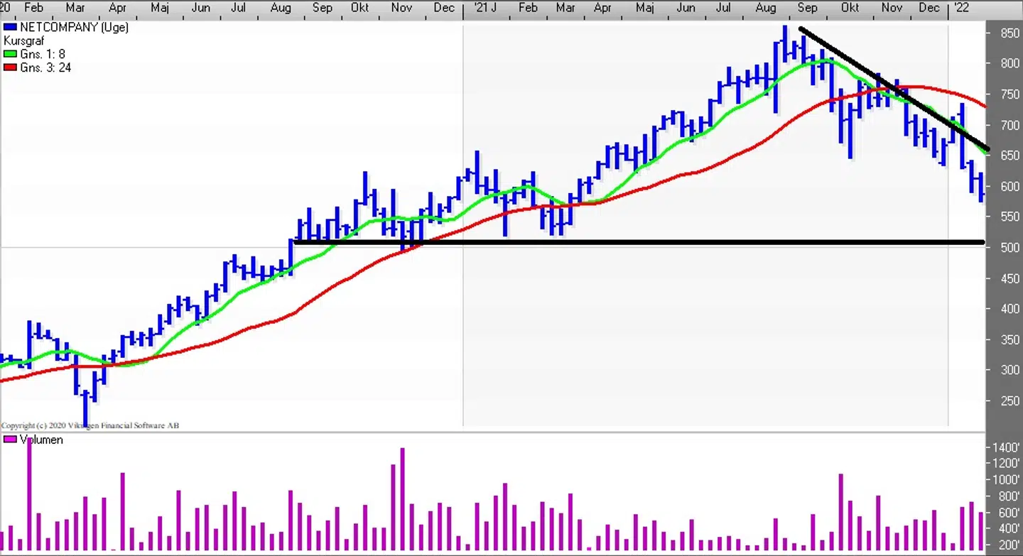 Netcompany er i en faldende tendens siden toppen i august i niveauet 850 og fredag lukkede aktien i 588. Første salgssignal kom i september siden i slutningen af november og nu i januar.