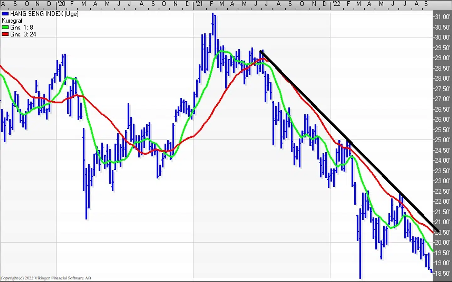 De glidende gennemsnit på 8 og 24 etablerede et Death Cross i juni 2021, og der er ikke på noget tidspunkt etableret et faldende købssignal i indekset - det har bare fortsat den faldende tendens.