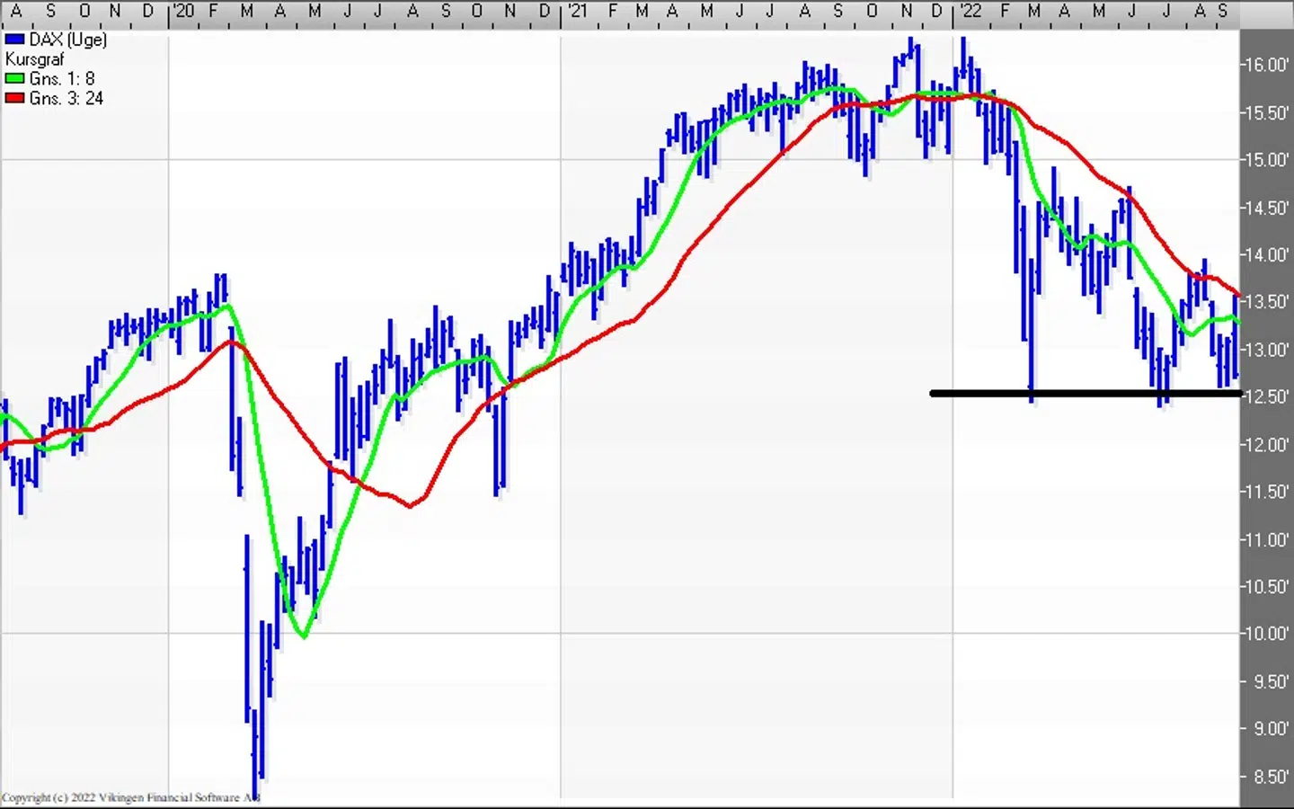 På dagsniveauet i DAX er der etableret salgssignal i både Bollingerkanalen og de glidende gennemsnit på 8 og 24. På ugebasis er der salgssignal i Bollingerkanalen, og det har stået på siden slutningen af august.