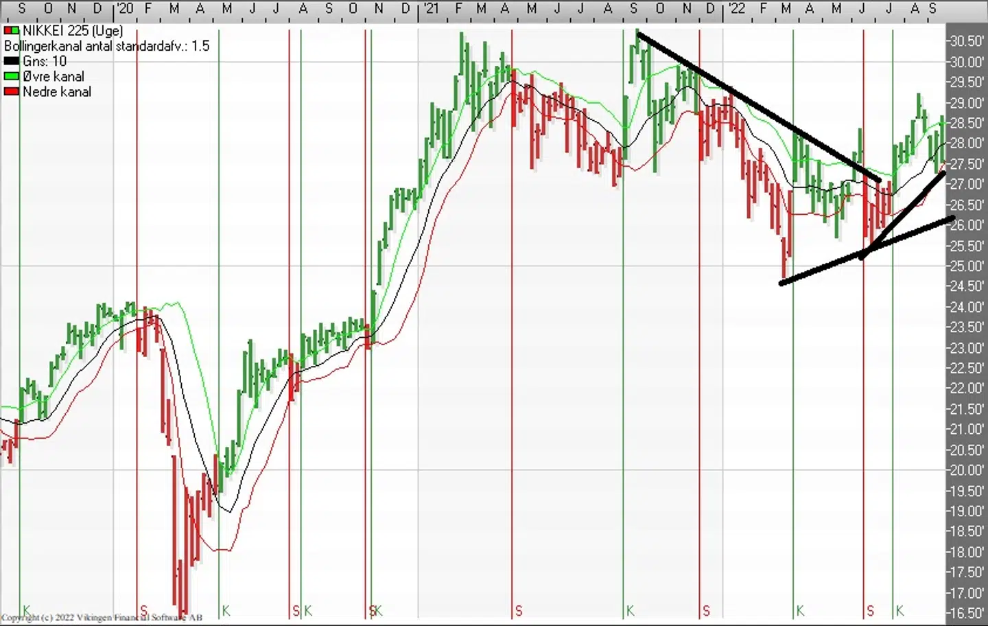 Det japanske indeks går enegang og holder fast den stigende tendens. På dagsniveauet er der dog etableret salgssignal i Bollingerkanalen og de glidende gennemsnit har etableret et Death Cross i begyndelsen af september.