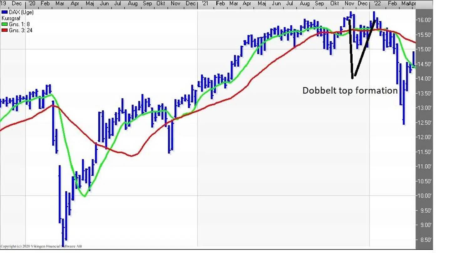 Det tyske indeks har to gange testet niveauet 16.200 i henholdsvis november og januar og siden har det været i en faldende tendens frem til midten af marts, hvor niveauet 12.600 blev nået. Dermed var der etableret en dobbelt topformation. Fredag lukkede indekset i kurs 14.446.