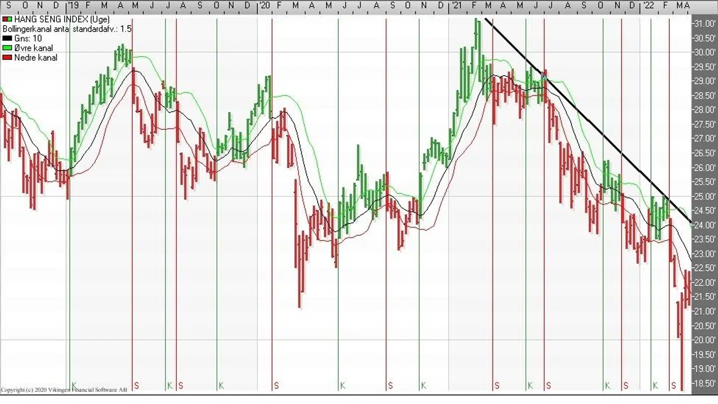 Hang Seng toppede i februar i niveauet 31.000 og lukkede fredag i niveauet 22.039. På dagsniveauet har Hang Seng som de øvrige internationale markeder etableret købssignal i midten af marts efter bund i niveauet 18.576.
