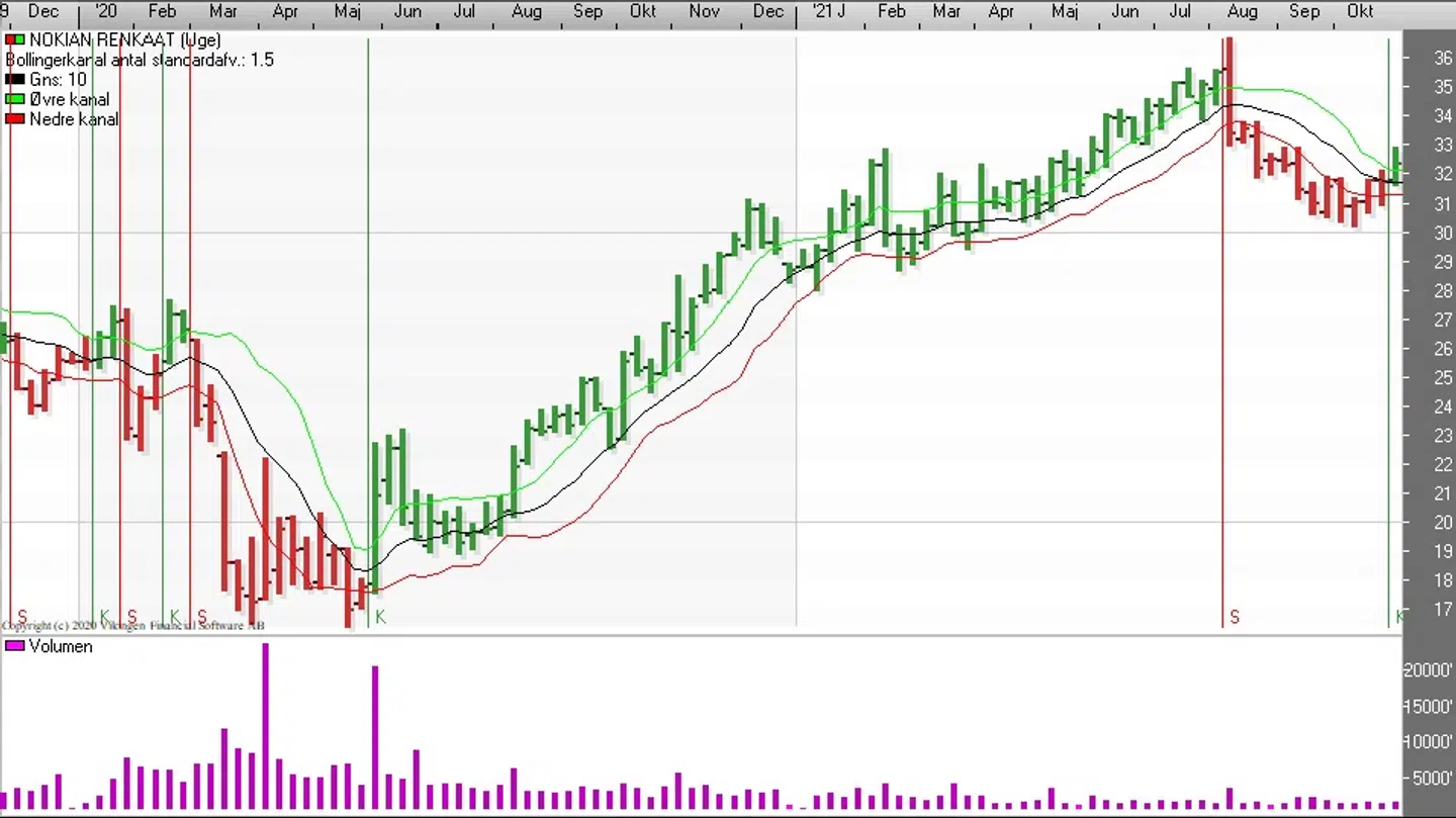 Nokian Tyres ((Nokian Renkaat) ser ud til at have fundet en bund i niveauet 30,3-30,8 og fredag lukkede aktien i 32,4. Stigningen betyder, at der er etableret købssignal på både dags- og ugeniveauet. På dagsniveauet etablerede de glidende gennemsnit et ”Golden Cross” i midten af oktober, hvor det korte glidende gennemsnit bryder op igennem det lange glidende gennemsnit nedefra. For tre dage siden blev modstandsniveauet 33 testet, men der var i første omgang ikke Momentum nok til at bryde igennem. Første gang modstandsniveauet 33 blev testet var i begyndelsen af september. Bollingerkanalen har på dagsniveauet etableret et købssignal i midten af oktober.