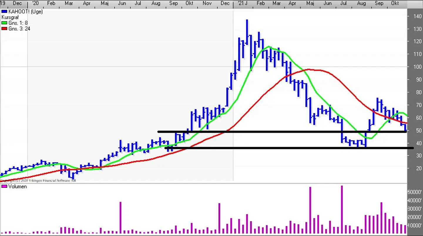 Kahoot-aktien toppede i januar i niveauet 137og siden lå aktien i en faldende tendens frem til august, hvor kursen ramte niveauet 36,28 to gange primo og medio august, hvorefter aktie steg op i 74 og har siden været i en faldende tendens og lukkede fredag i niveauet 50.30.