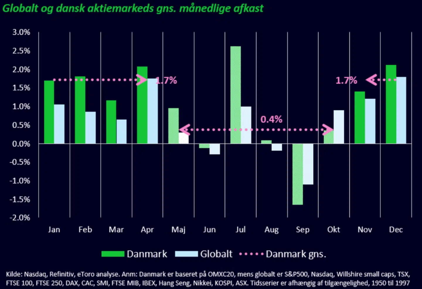 Vi ser disse sæsonudsving på tværs af alle 15 markeder, og ingen af markederne oplever stærkere afkast i sommerhalvåret. Det danske indeks underpræsterer også fra maj til oktober med et afkast på 0,4 pct.