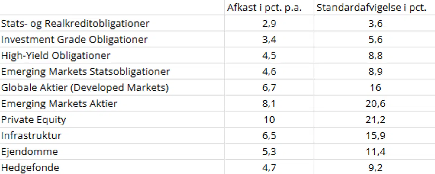 Går du skridtet videre og blander 35 pct. aktier, 35 pct. obligationer, 10 pct. ejendomme og 20 pct. øvrige illikvide investeringer – som fx private equity – så holder du fortsat afkastforventningerne på 6,2 pct. i gennemsnit pr. år – men nu er risikoen helt nede på 10,7 pct..