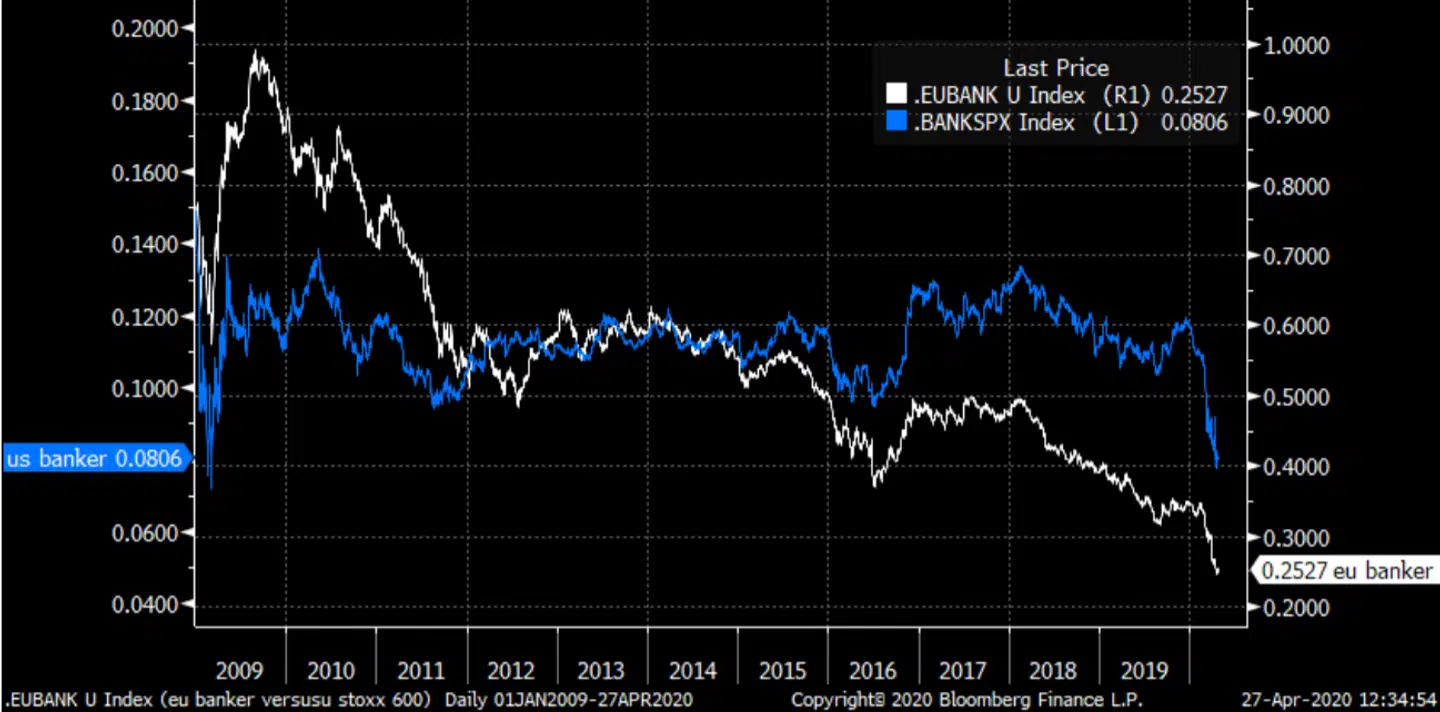 Problemet er ikke, at amerikanske banker både underperformede, da aktiemarkedet styrtdykkede i marts, men derimod at de er fortsat med at underforme under aktiemarkedets comeback i april. Det illustrerer, at der stadig – bagved aktiemarkedets comeback - er en stor usikkerhed om vækstudsigterne blandt investorerne. De enorme hjælpepakker har været med til at spænde et sikkerhedsnet under kreditmarkederne og dermed indirekte også aktiemarkedet. Men investorerne vurderer stadig, at der er alt for langt til den anden side af kløften til, at de atter tør tro på fast grund under fødderne for bankerne – og dermed et cyklisk opsving i økonomien.