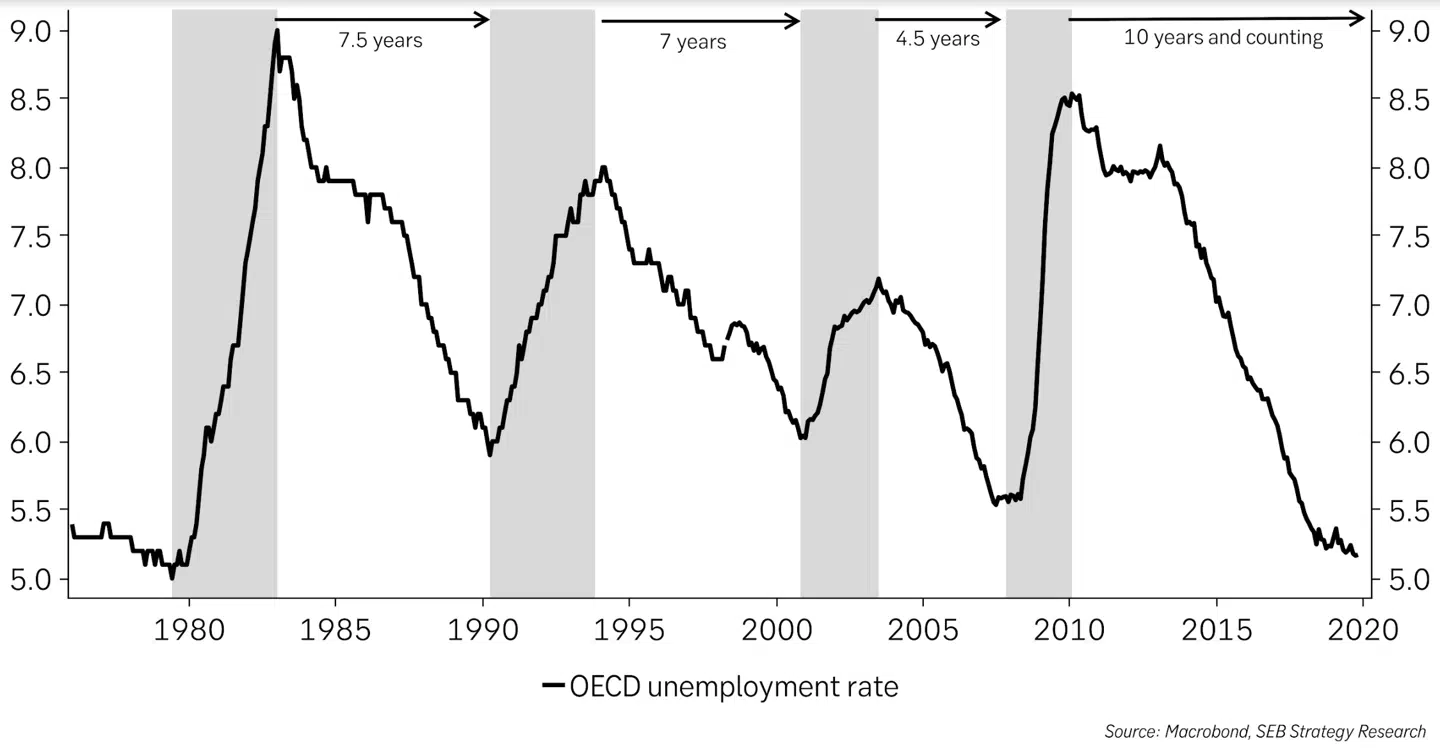 2019 bød på store stigninger på aktiemarkedet på trods af - eller måske snarere på grund af - en meget udbredt frygt for en global recession, der aldrig materialiserede sig. Frygten for recession skyldes blandt andet, at det nu er over 10 år siden, at det globale opsving indledtes i efteråret 2009. Dermed er opsvinget det længste, vi nogensinde har oplevet, men det betyder ikke nødvendigvis, at det skal slutte nu.
