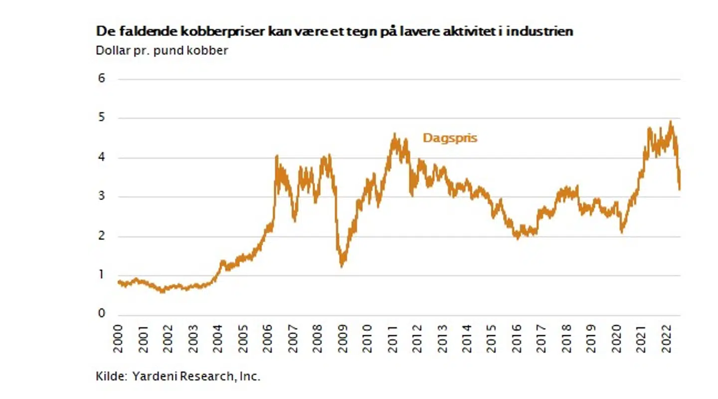 Råvaremarkederne fortæller os, at dette ikke kun er en energikrise. Det skyldes, at inflationen ikke kun skaber en rentestigning. Den giver også faldende realløn, faldende købekraft og mindre boligefterspørgsel. Dette giver frygt for faldende vækstrater og dermed mindre råvareefterspørgsel. Vi ser det tydeligt i udviklingen for kobberpriserne, der nu er faldet med mere end 25 pct., siden Rusland startede krigen i marts måned.