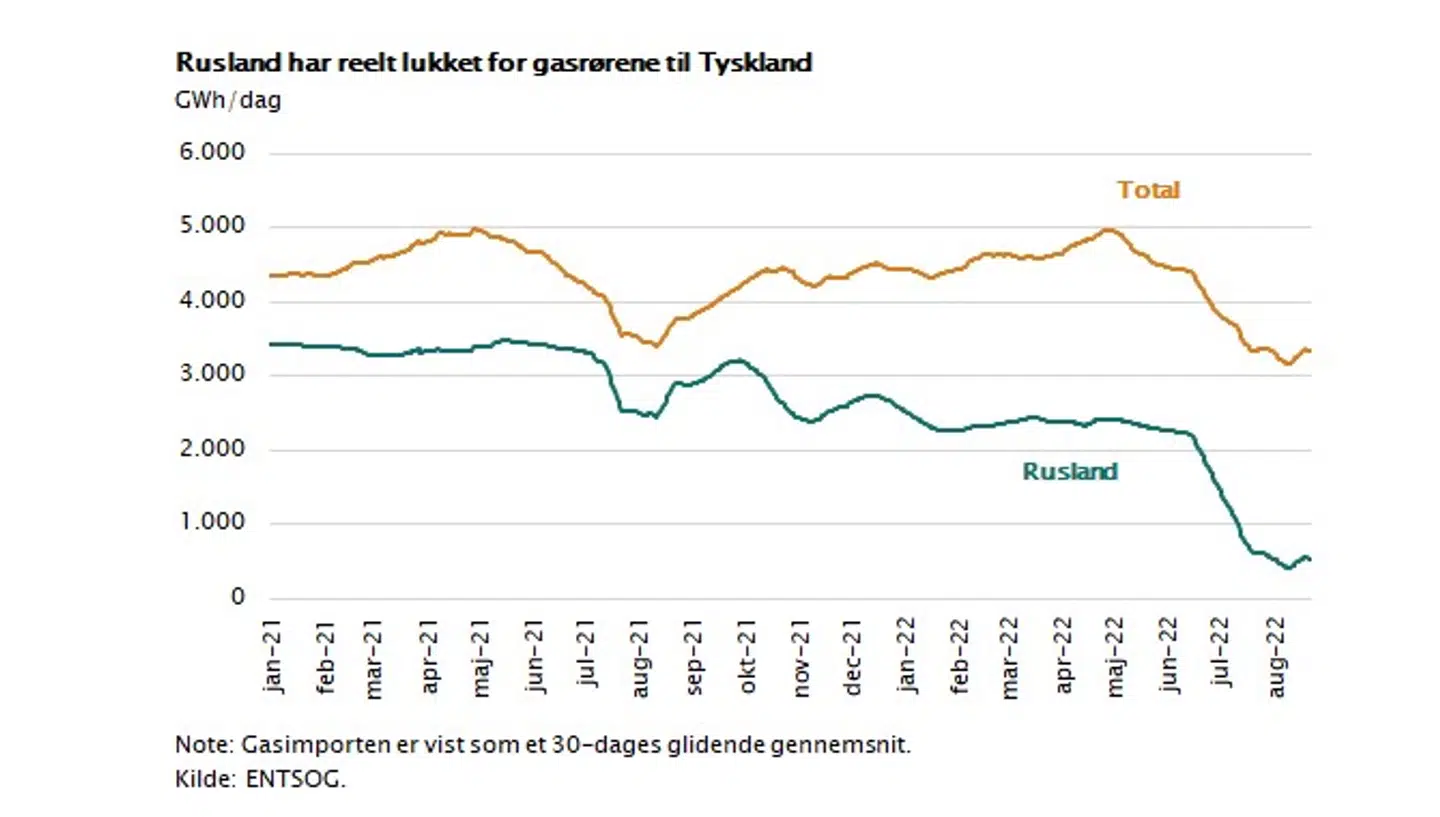 Alle de forbrugere og virksomheder, der oplever store stigninger i energipriserne, nedjusterer deres indkøb, finder erstatninger og reducerer energiforbruget. I figuren vises, hvor meget naturgas Tyskland importerer, og hvor meget som kommer fra Rusland. Bemærk, at Rusland reelt allerede har lukket for naturgassen.