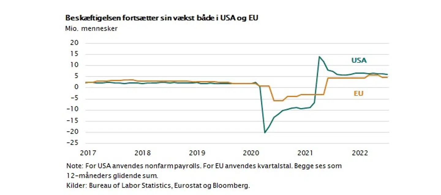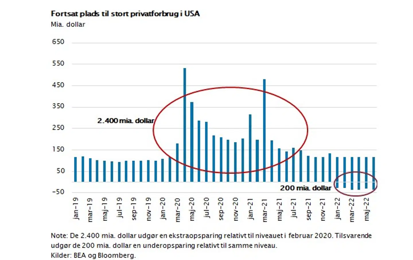 Amerikansk økonomi står i en helt anden og meget bedre situation. USA er selvforsynende med energi, den private gældsituation er normaliseret, erhvervslivet er konkurrencedygtigt, og ikke mindst er der fortsat en stor finansiel covid-opsparing til rådighed til fortsat forbrug. Det forhold, at inflationen i måneder har ligget på 9 pct., mens lønstigningen har været lavere, vil selvfølgelig tære på den private opsparing.
