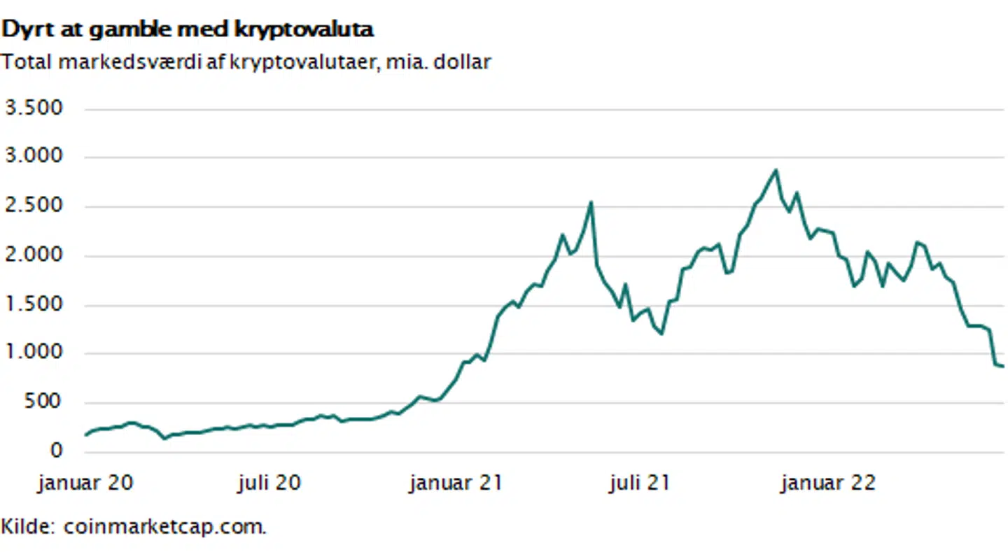 I figuren er vist den samlede værdi af al krypto, som handles globalt. Bemærk, at værditabet de seneste 6 måneder er på mere end 65 pct. Nogle hævder, at det blot er en kortvarig krise, og at markedet snart stabiliseres og stiger igen. Påstanden er, at blockchain er en værdifuld teknologi, men det er alene en IT-kode, som ikke kan købes. Hvis en virksomhed bruger blockchain til at skabe forretning, bliver den pågældende virksomhed måske værdifuld, men blockchain har det ligesom alfabetet – man kan ikke købe det.