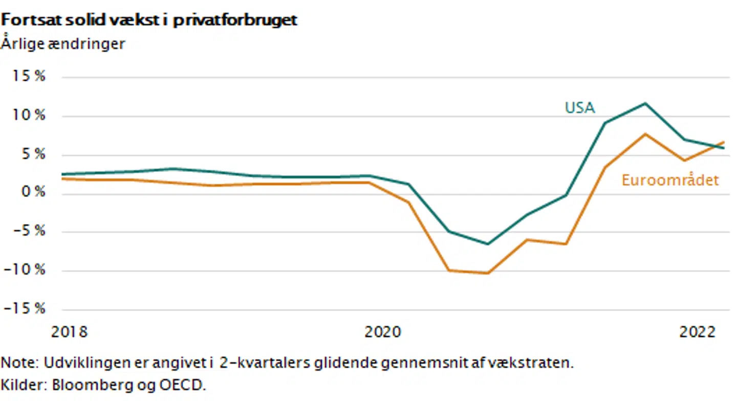 I figuren er vist udviklingen i privatforbrugets vækst i EU og USA. Der er fortsat solid vækst. Selvfølgelig er de disponible indkomster presset af stigende inflation, men lønstigninger kompenserer for dette. Den disponible opsparing er fortsat enorm pga. de store kontante covid-pakker. De private borgere har større formuer end nogensinde, og bankerne er villige og har kapital til nye udlån. Alt i alt gunstige ydre betingelser for en fortsat fremgang i privatforbruget. Derfor er sandsynligheden for en økonomisk recession meget beskeden.