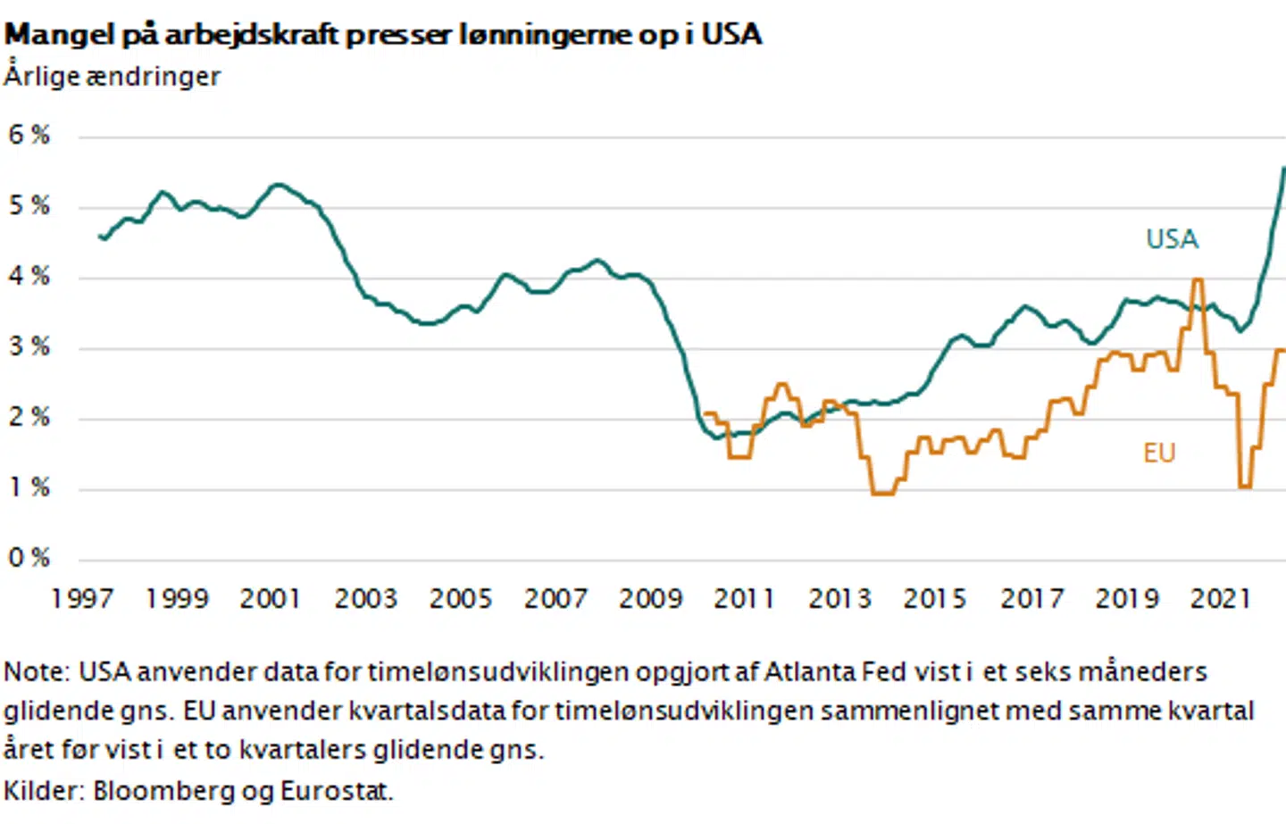 Hvad man derimod kan frygte er, at inflationen særligt i USA bliver svær at bekæmpe de næste par år. Der mangler så meget arbejdskraft, at det presser lønstigningerne op over 6 pct. årligt og dermed bidrager til at forlænge inflationsperioden ind i 2023. I EU er lønpresset mindre og formentlig det halve af USAs.