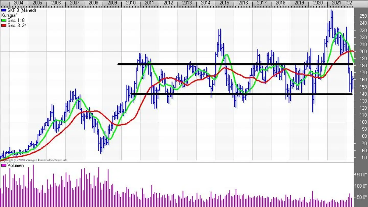 SKF-aktien er faldet 24 pct. Det ruller ikke rigtigt for kuglelejefabrikkerne. Aktien er et klart bevis på en cyklisk aktie, som bevæger sig i et vist handelsniveau og så få gange er kursen stukket af, men det er ”bare” for at komme tilbage til samme niveau som har været 140-180.