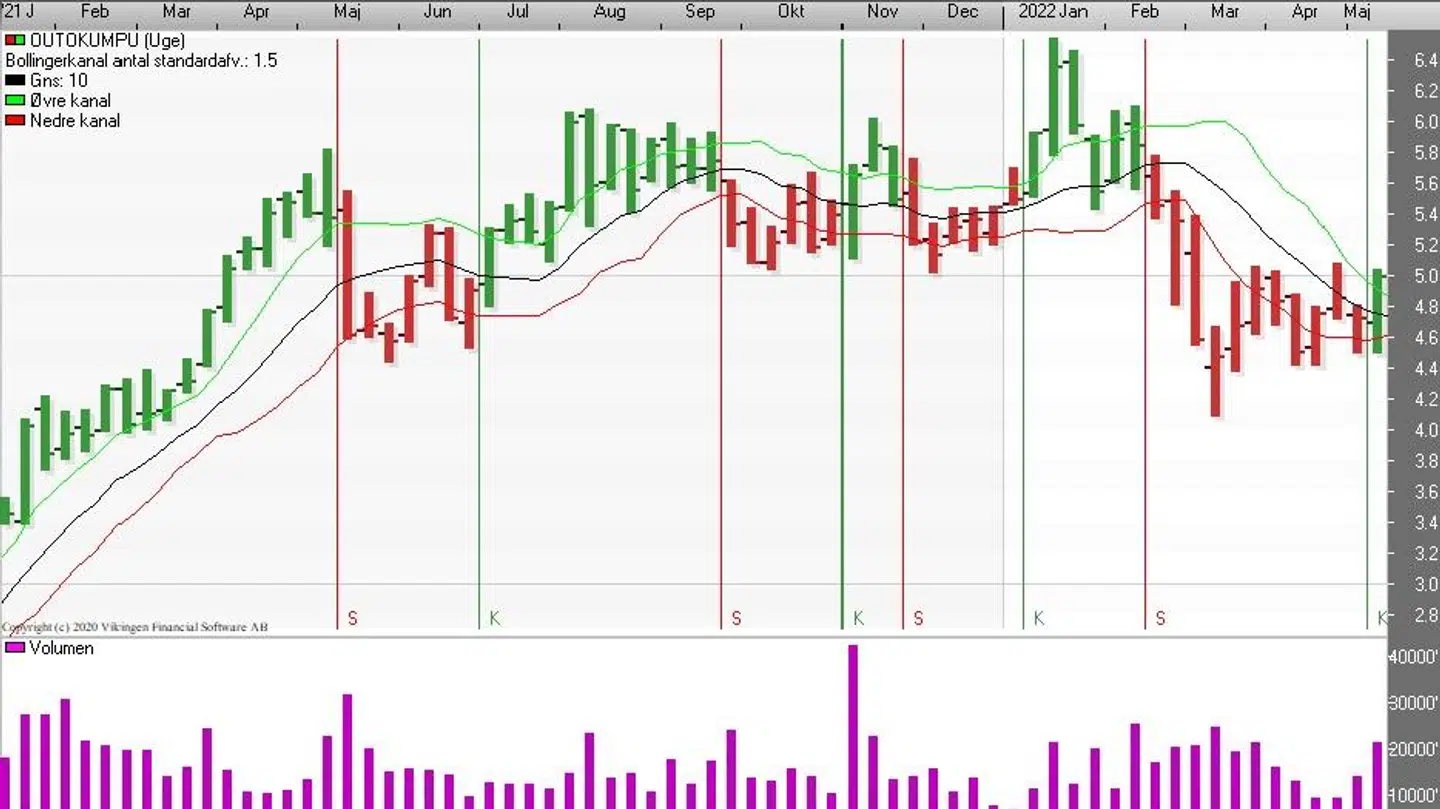 Der er etableret et ”Golden Cross” på dagsniveauet, hvor det korte glidende gennemsnit er brudt igennem det lange glidende gennemsnit nedefra. Bollingerkanalen er ligeledes gået i køb på dagsniveauet.