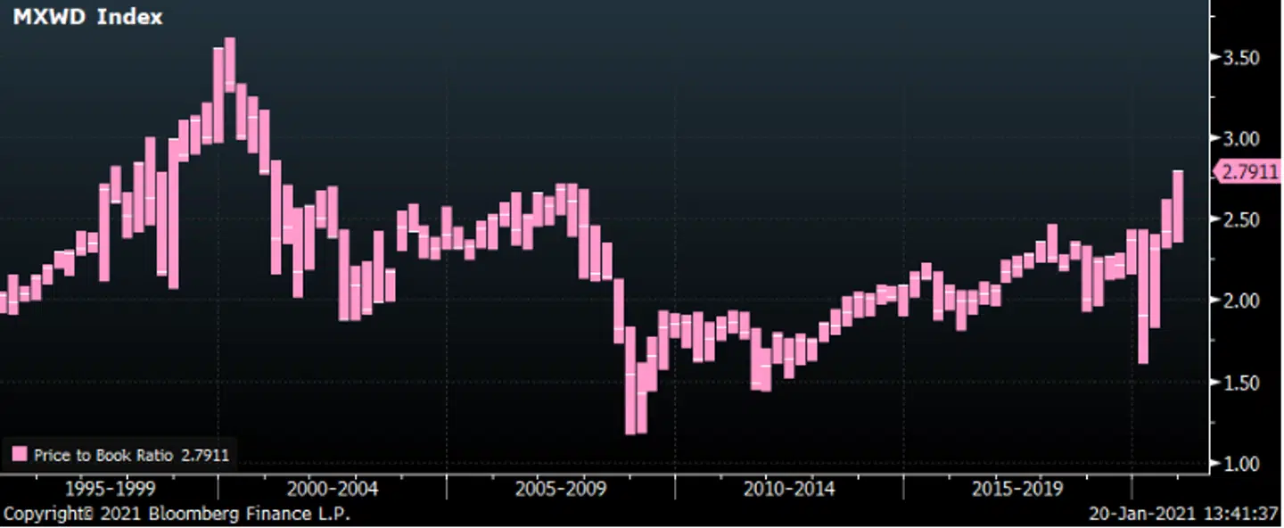 Vi begynder i den ende, der bobler mest. Målt ved traditionelle aktienøgletal, og i forhold til deres egen historie, er aktier højt prissat (1), og vi skal som hovedregel tilbage til perioden 1999-2000 for at finde en højere prissætning.