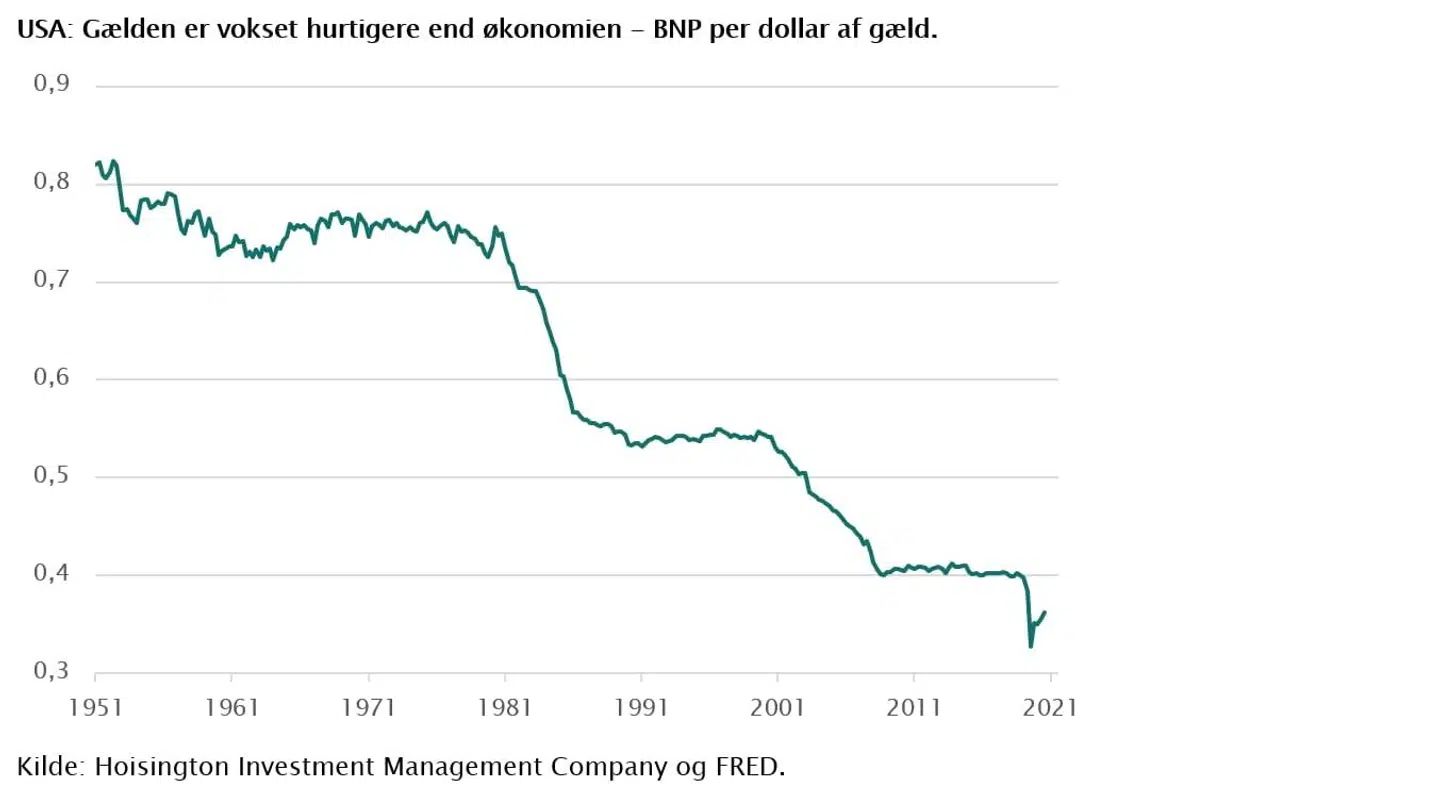 Samtidig er nogle økonomer bekymrede for, at ny gæld ikke skaber samme vækst i økonomien, som vi har set tidligere. En af de mest fremtrædende er Lacy Hunt fra Hoisington, som mener, at den økonomiske gevinst fra ny gæld er langt lavere end tidligere. Han bygger sit synspunkt på observationen, at gælden er vokset hurtigere og hurtigere relativt til BNP de seneste 70 år. Gælden ser dermed ikke ud til at skabe samme økonomiske vækst som tidligere. Hunt knytter observationen til den klassiske økonomiske teori om aftagende marginalprodukt, der beskriver, at hvis der tilføres for meget af en produktionsfaktor, vil det marginale slutprodukt være aftagende.
