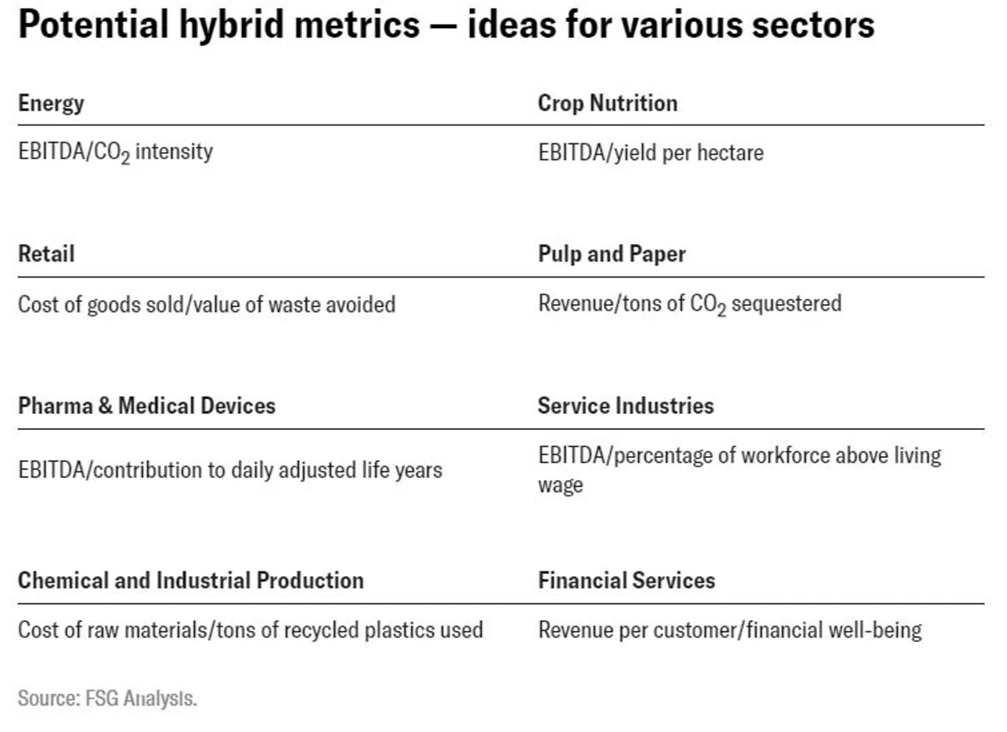 Ovenfor kan I se Shared value instituttets anbefalinger til hybride målepunkter for forskellige sektorer.